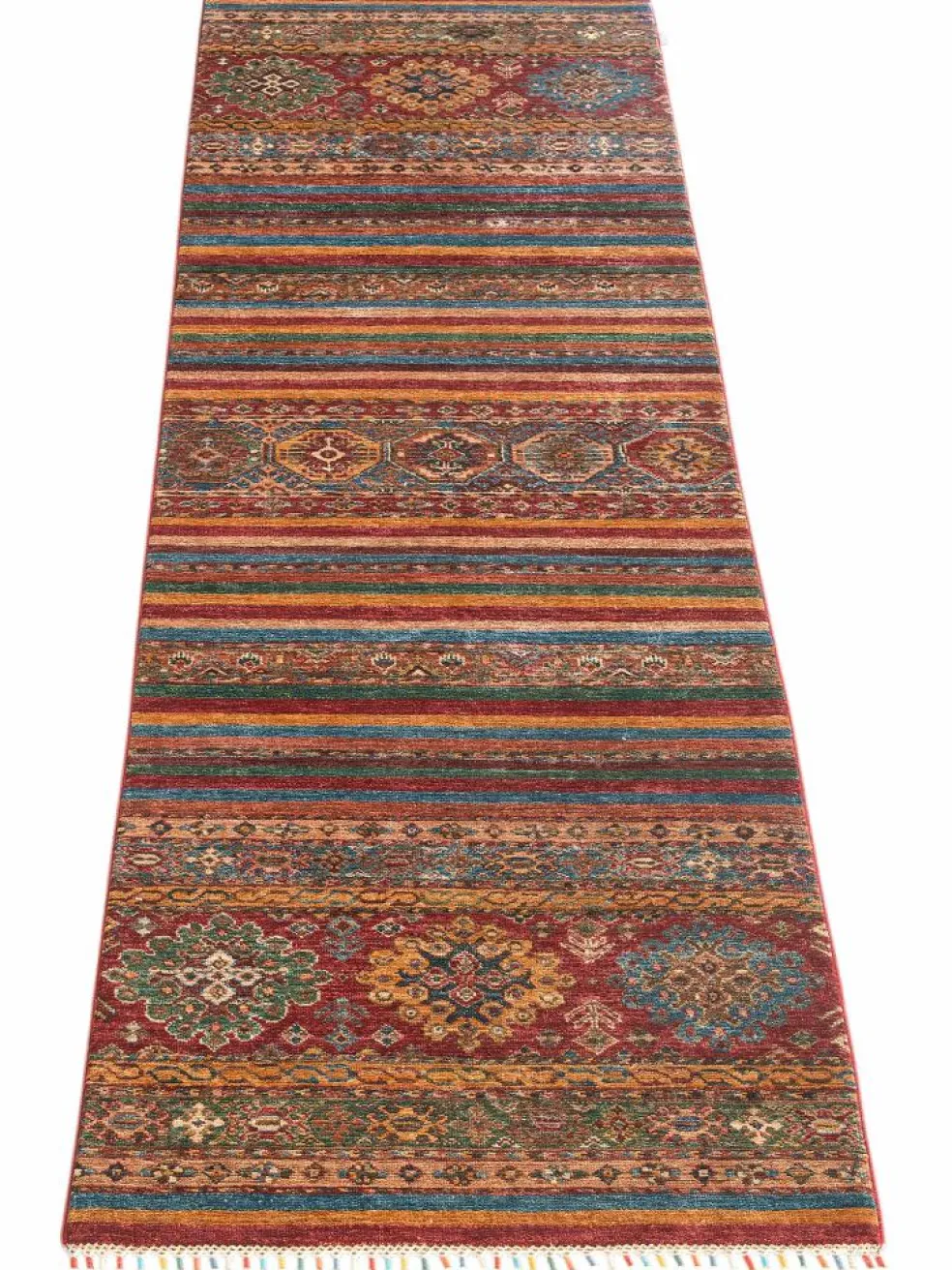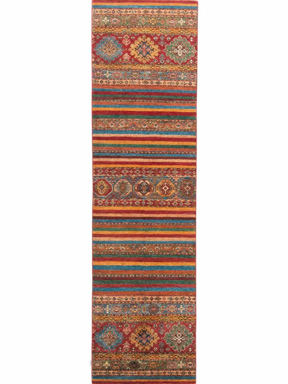 -Muster sind bunte Längsstreifen mit vielen verschiedenen Motiven gefüllt. Durch den flachen und festen Flor ist der Teppich unempfindlich gegenüber den Belastungen des Alltags.- Das Besondere an diesemOrientteppich
