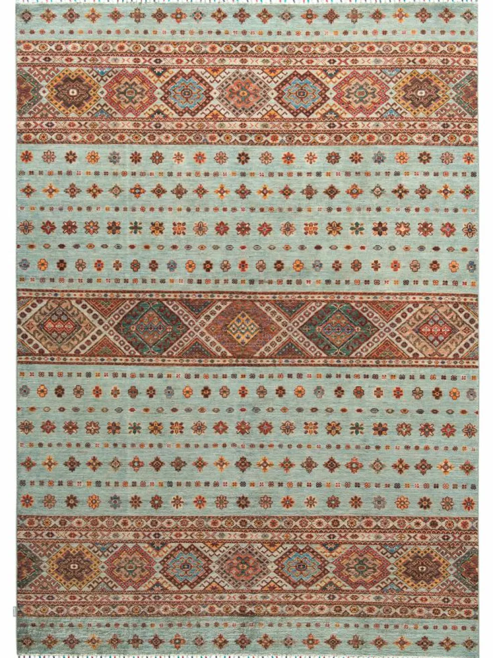 -Muster sind bunte Längsstreifen mit vielen verschiedenen Motiven gefüllt. Durch den flachen und festen Flor ist der Teppich unempfindlich gegenüber den Belastungen des Alltags.- Das Besondere an diesemOrientteppich