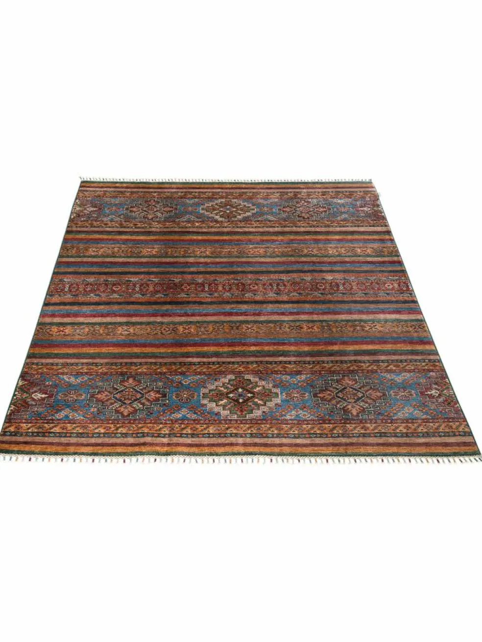 -Muster sind bunte Längsstreifen mit vielen verschiedenen Motiven gefüllt. Durch den flachen und festen Flor ist der Teppich unempfindlich gegenüber den Belastungen des Alltags.- Das Besondere an diesemOrientteppich