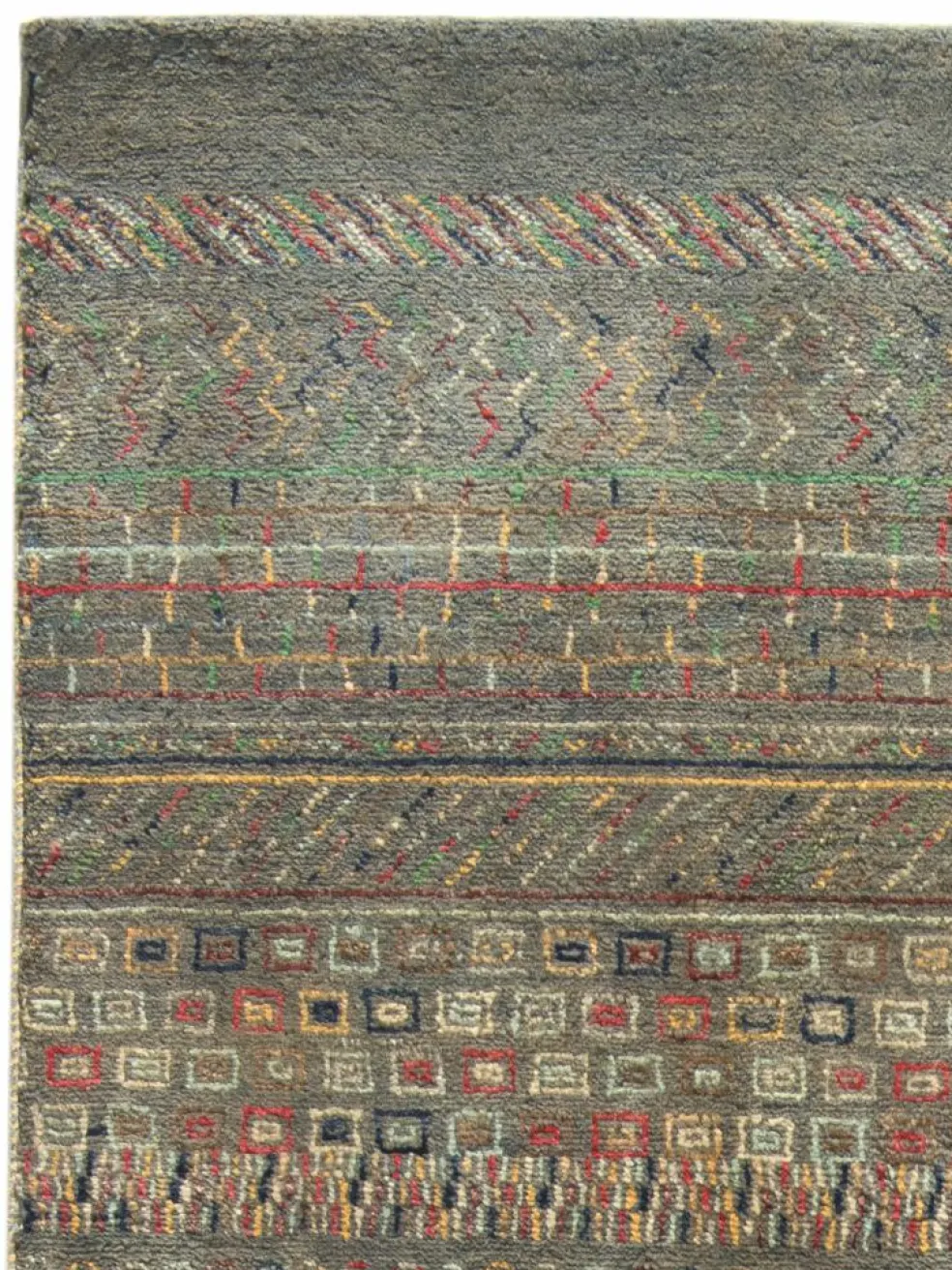 ist eine ungewöhnliche moderne Variation des traditionellen persichen Gabbehs. Er ist kürzer im Flor und feiner geknüpft. Es gibt zahllose Neukreationen in individuellen und einzigartigen Farben und Mustern.| Gesamthöhe: | ca. 7 mm |