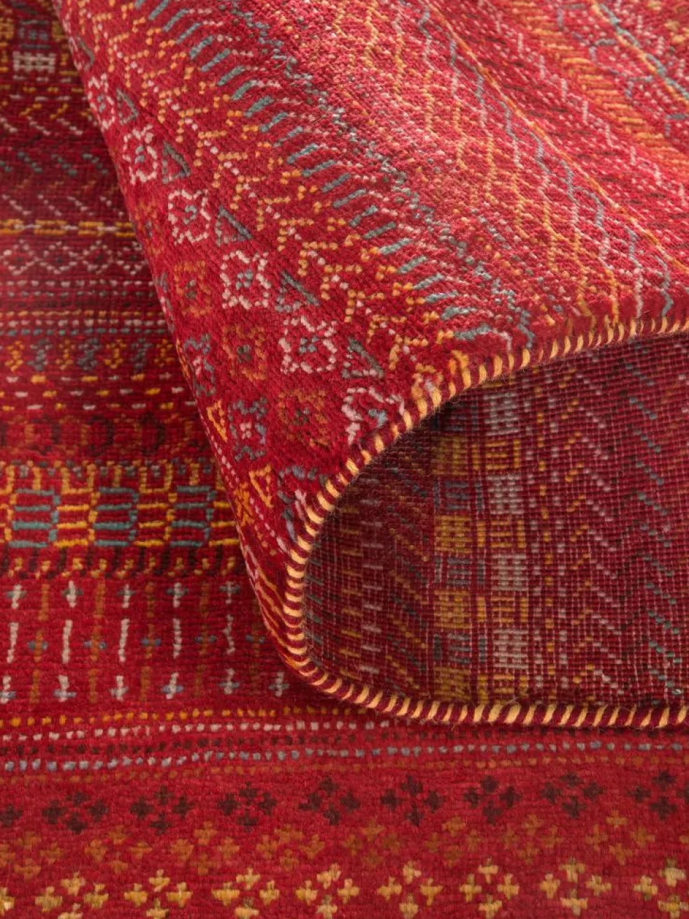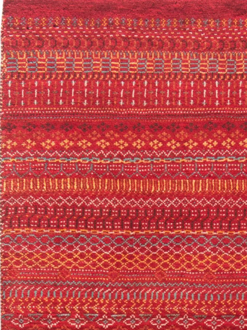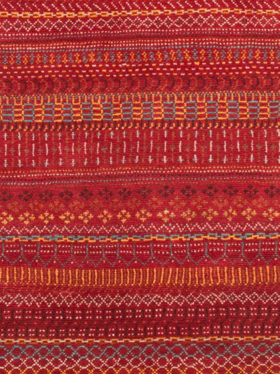 ist eine ungewöhnliche moderne Variation des traditionellen persichen Gabbehs. Er ist kürzer im Flor und feiner geknüpft. Es gibt zahllose Neukreationen in individuellen und einzigartigen Farben und Mustern.| Gesamthöhe: | ca. 10 mm |