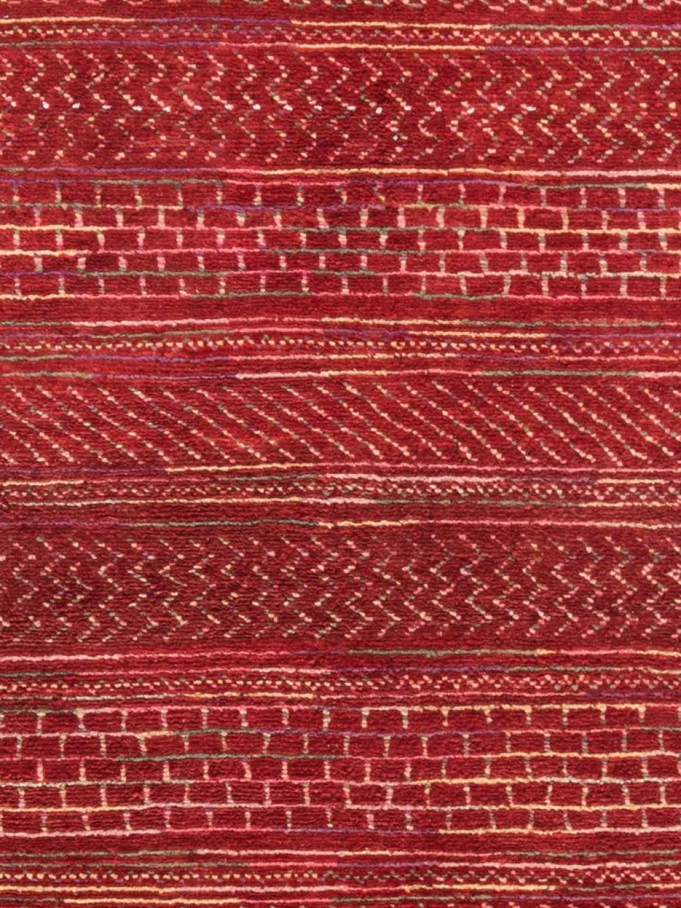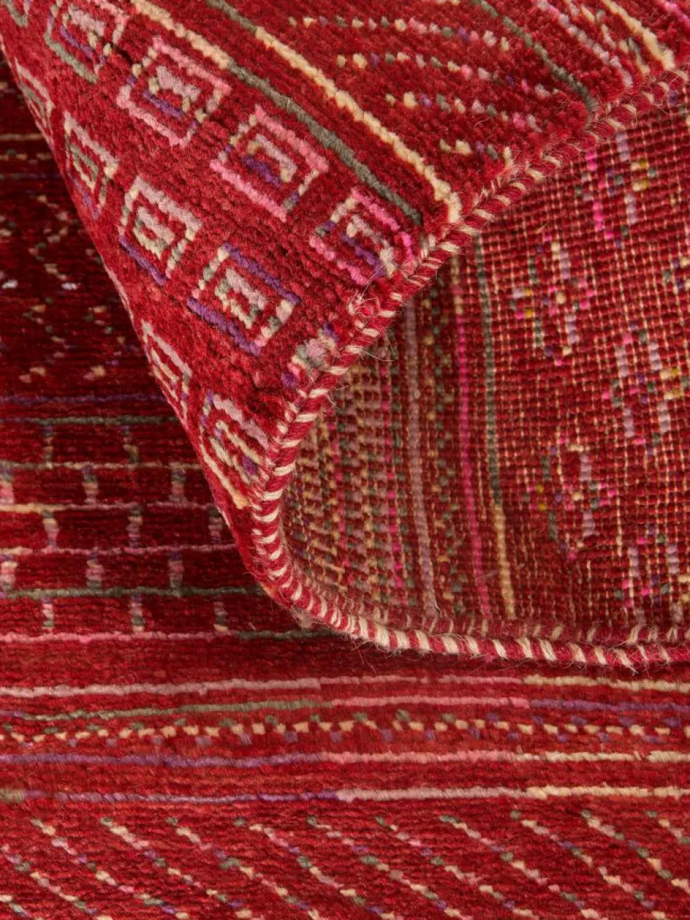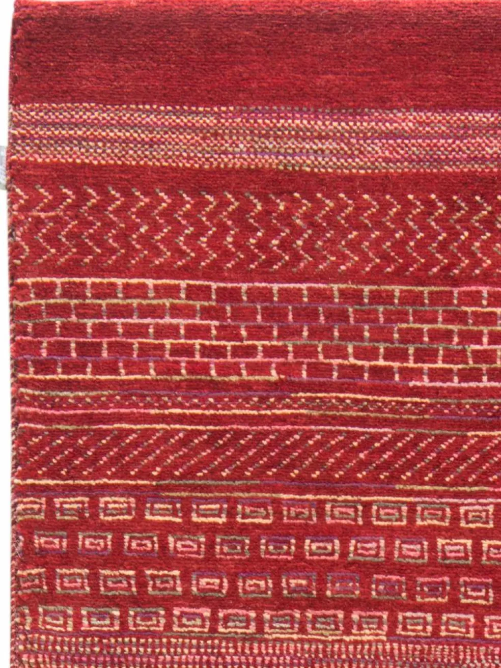 ist eine ungewöhnliche moderne Variation des traditionellen persichen Gabbehs. Er ist kürzer im Flor und feiner geknüpft. Es gibt zahllose Neukreationen in individuellen und einzigartigen Farben und Mustern.| Gesamthöhe: | ca. 10 mm |