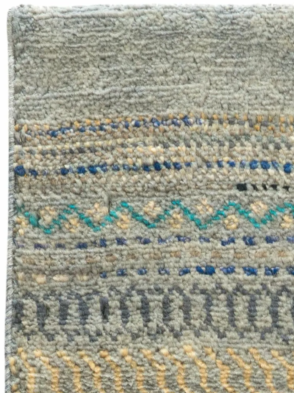 ist eine ungewöhnliche moderne Variation des traditionellen persichen Gabbehs. Er ist kürzer im Flor und feiner geknüpft. Es gibt zahllose Neukreationen in individuellen und einzigartigen Farben und Mustern.| Gesamthöhe: | ca. 7 mm |