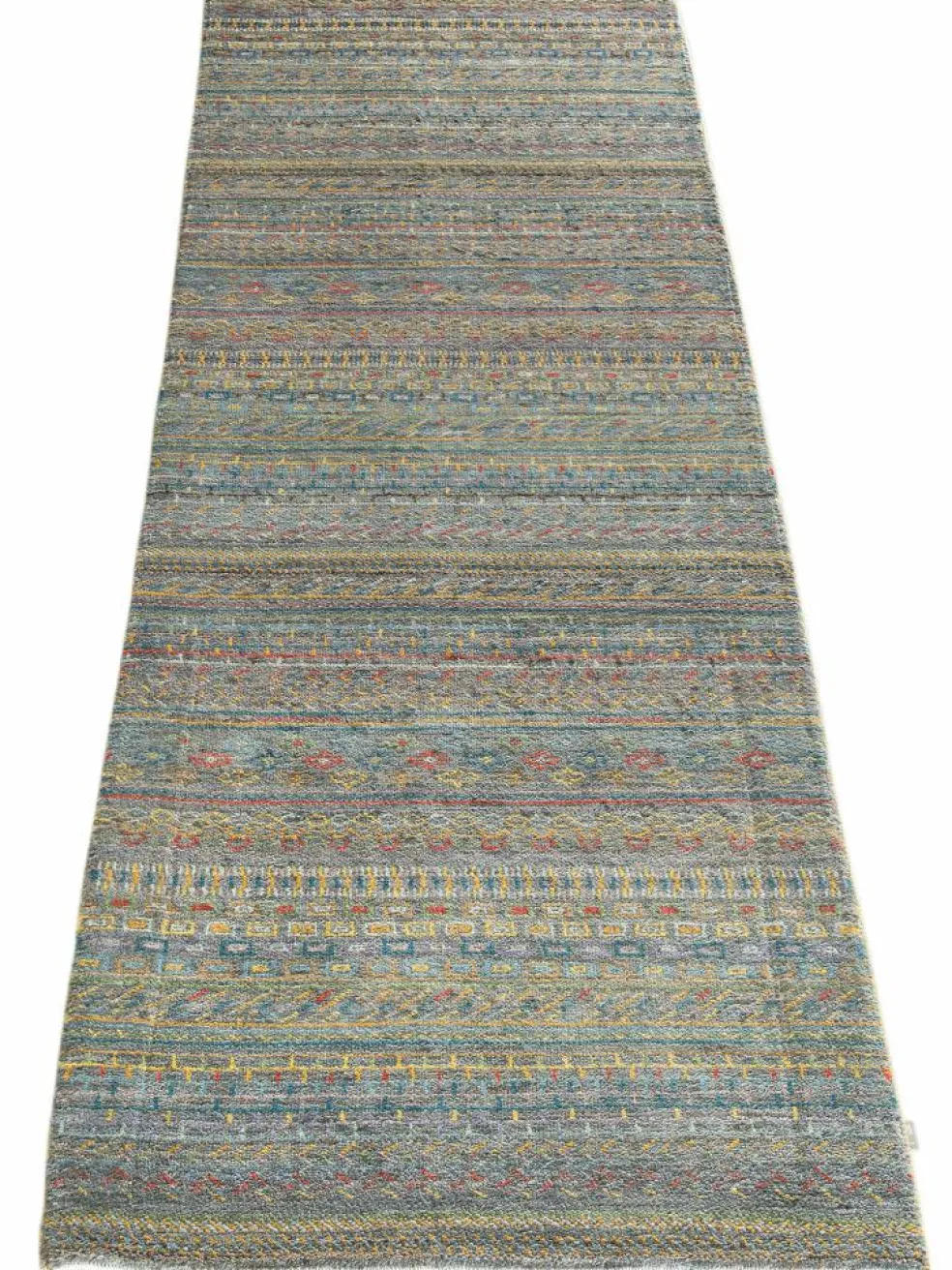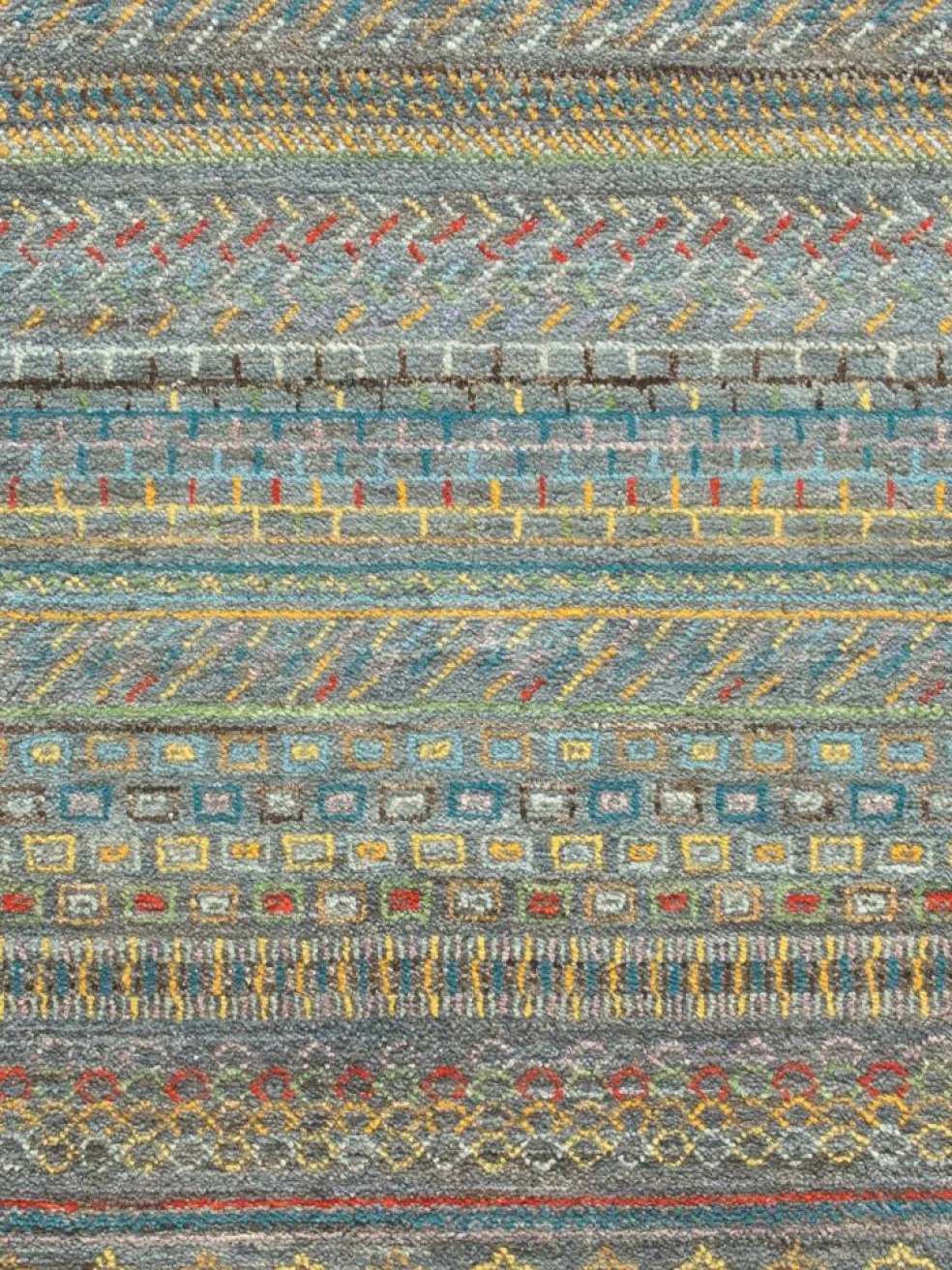 ist eine ungewöhnliche moderne Variation des traditionellen persichen Gabbehs. Er ist kürzer im Flor und feiner geknüpft. Es gibt zahllose Neukreationen in individuellen und einzigartigen Farben und Mustern.| Gesamthöhe: | ca. 10 mm |