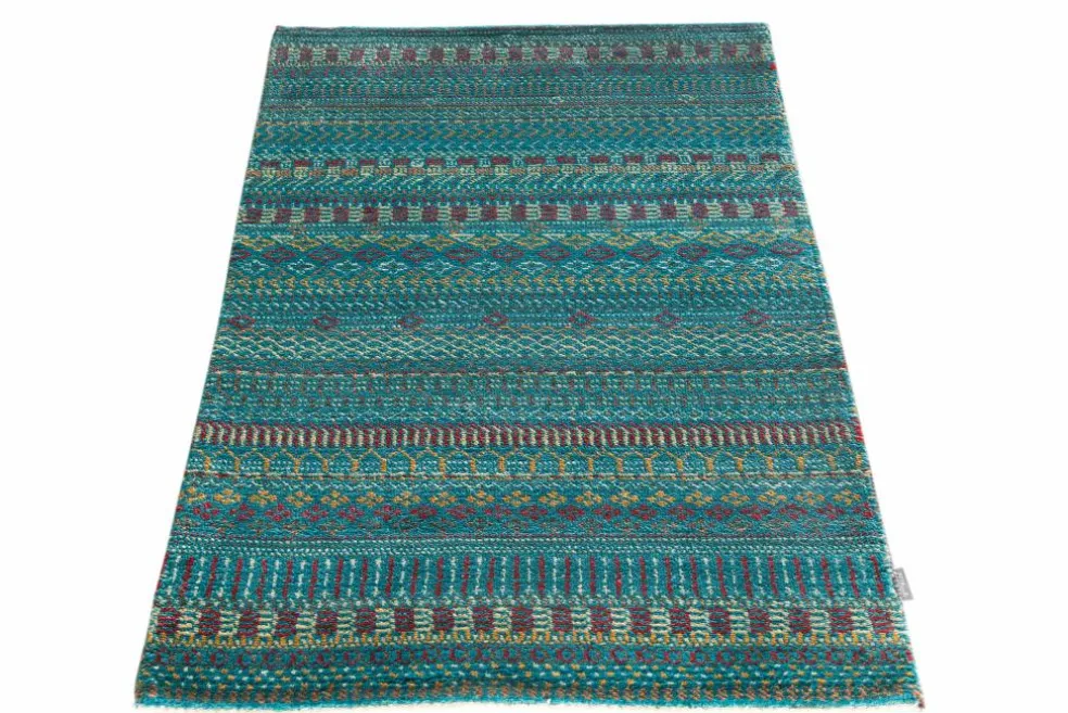 ist eine ungewöhnliche moderne Variation des traditionellen persichen Gabbehs. Er ist kürzer im Flor und feiner geknüpft. Es gibt zahllose Neukreationen in individuellen und einzigartigen Farben und Mustern.| Gesamthöhe: | ca. 10 mm |