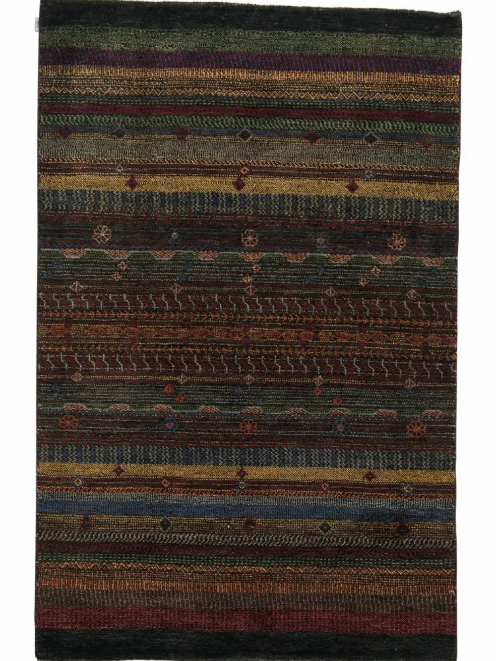 ist eine ungewöhnliche moderne Variation des traditionellen persichen Gabbehs. Er ist kürzer im Flor und feiner geknüpft. Es gibt zahllose Neukreationen in individuellen und einzigartigen Farben und Mustern.| Gesamthöhe: | ca. 7 mm |