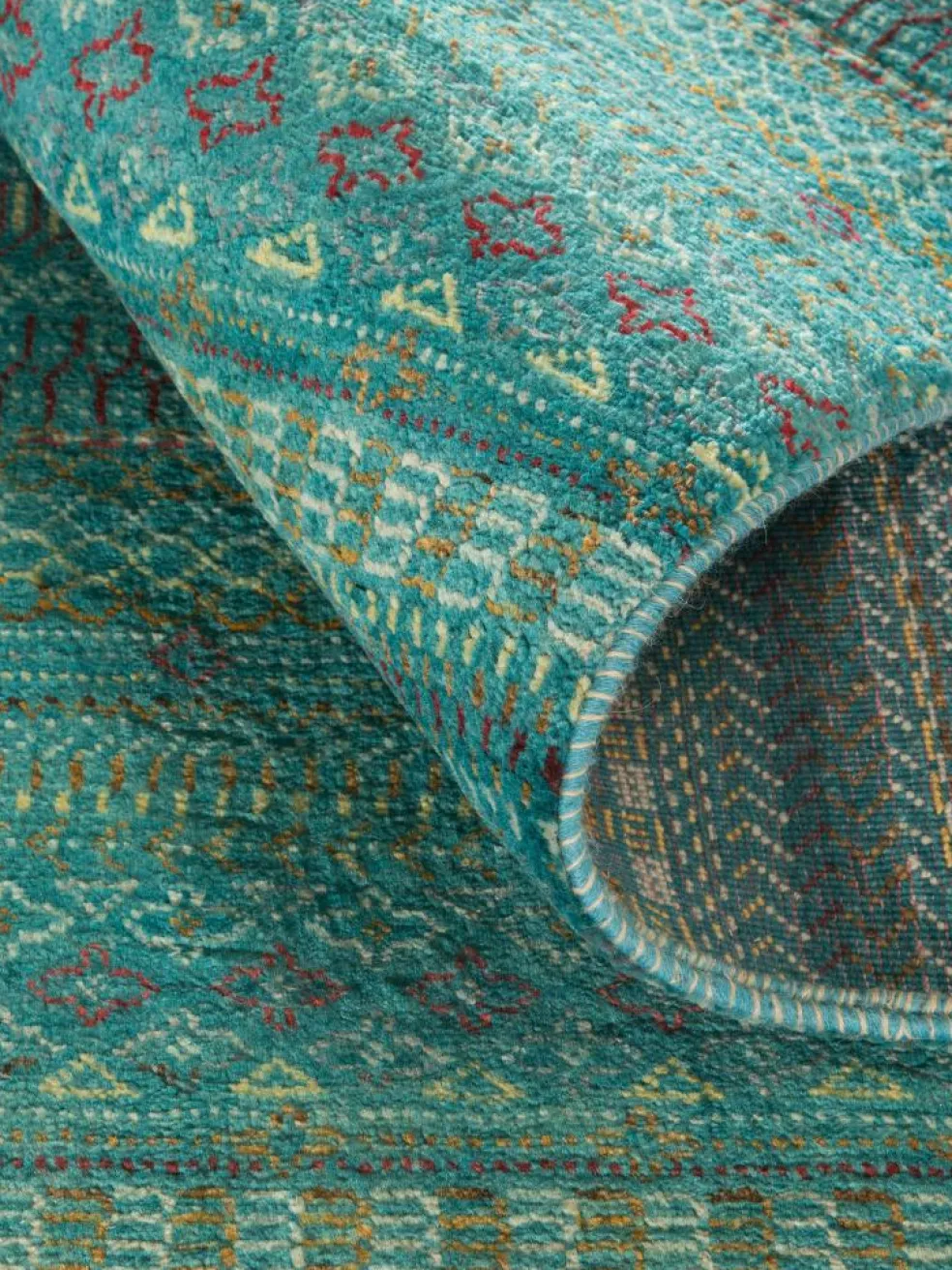 ist eine ungewöhnliche moderne Variation des traditionellen persichen Gabbehs. Er ist kürzer im Flor und feiner geknüpft. Es gibt zahllose Neukreationen in individuellen und einzigartigen Farben und Mustern.| Gesamthöhe: | ca. 10 mm |