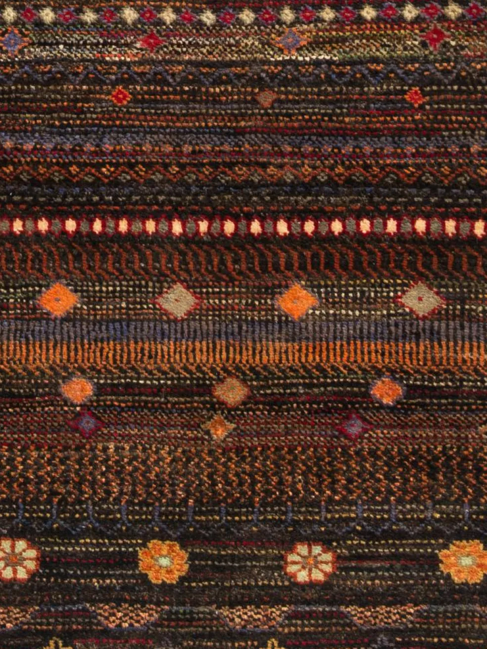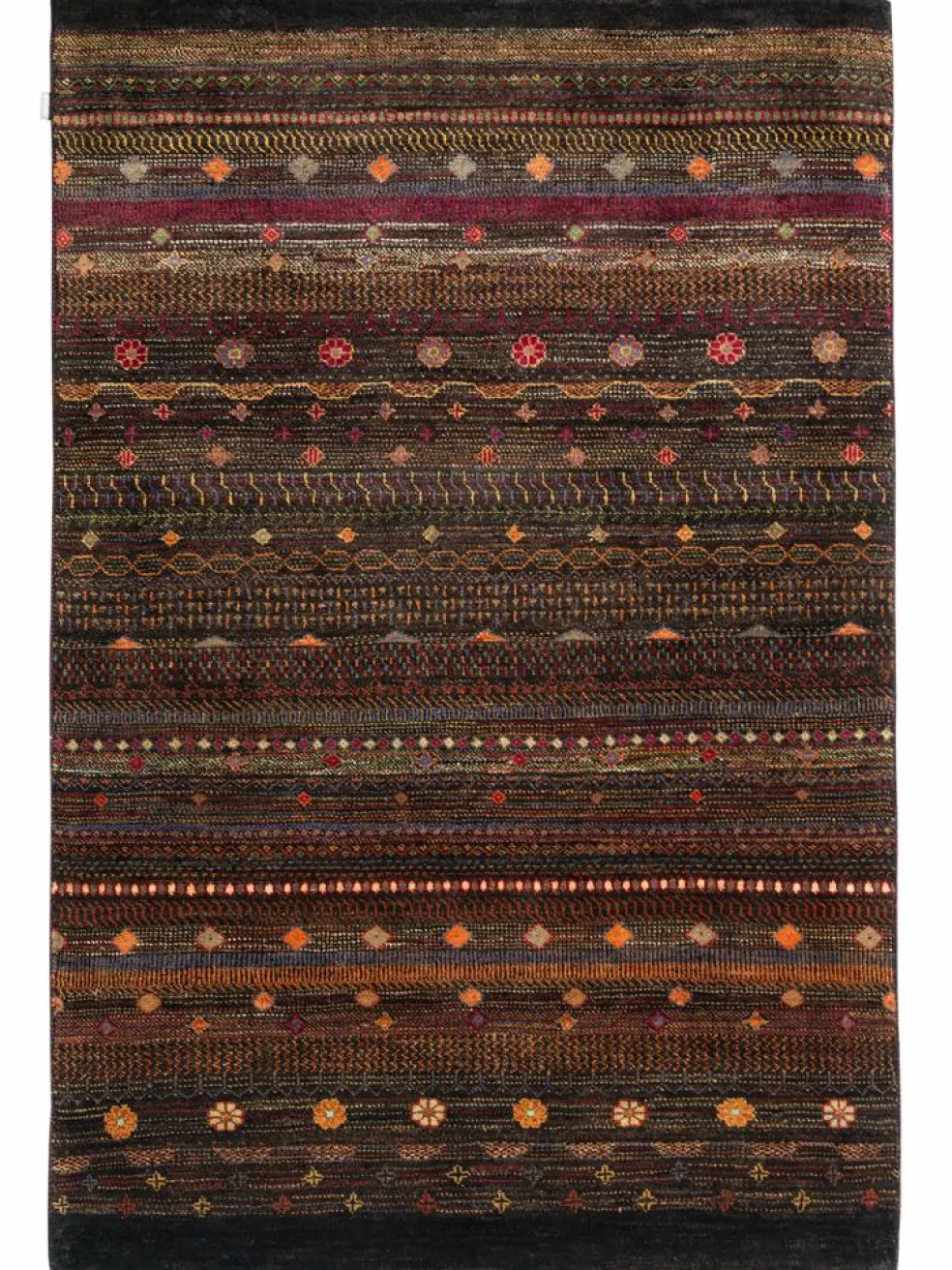 ist eine ungewöhnliche moderne Variation des traditionellen persichen Gabbehs. Er ist kürzer im Flor und feiner geknüpft. Es gibt zahllose Neukreationen in individuellen und einzigartigen Farben und Mustern. – Fein geknüpft inDouble-Knot