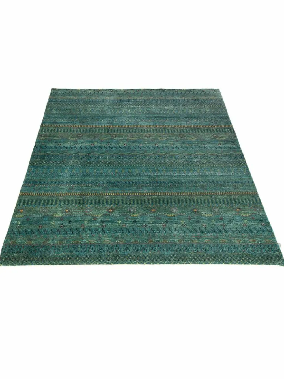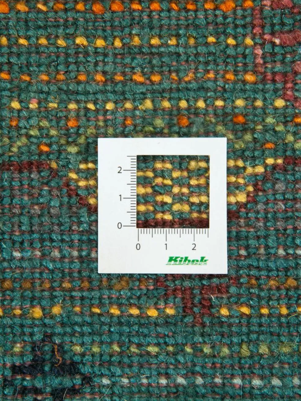 ist eine ungewöhnliche moderne Variation des traditionellen persichen Gabbehs. Er ist kürzer im Flor und feiner geknüpft. Es gibt zahllose Neukreationen in individuellen und einzigartigen Farben und Mustern.| Gesamthöhe: | ca. 10 mm |