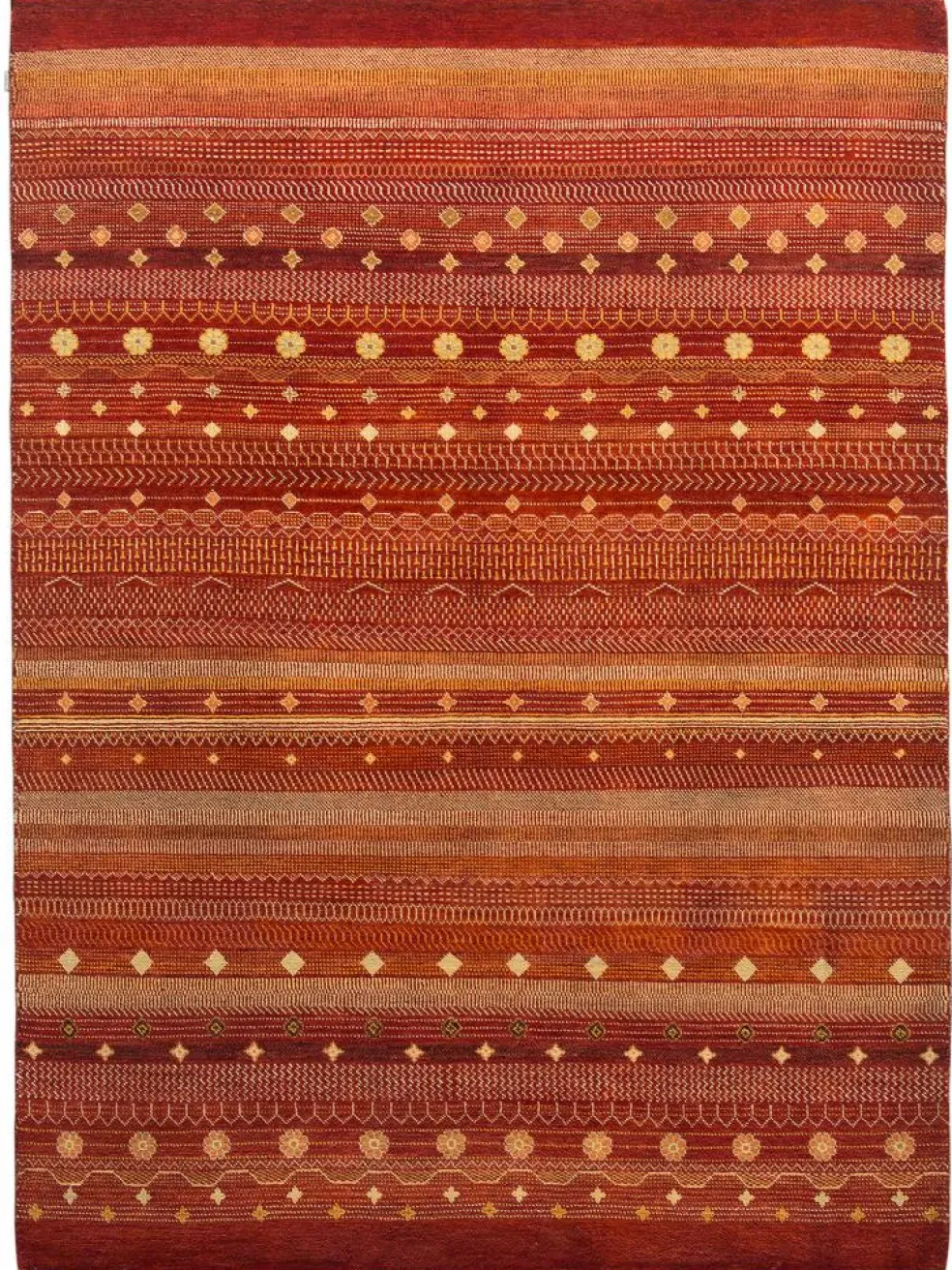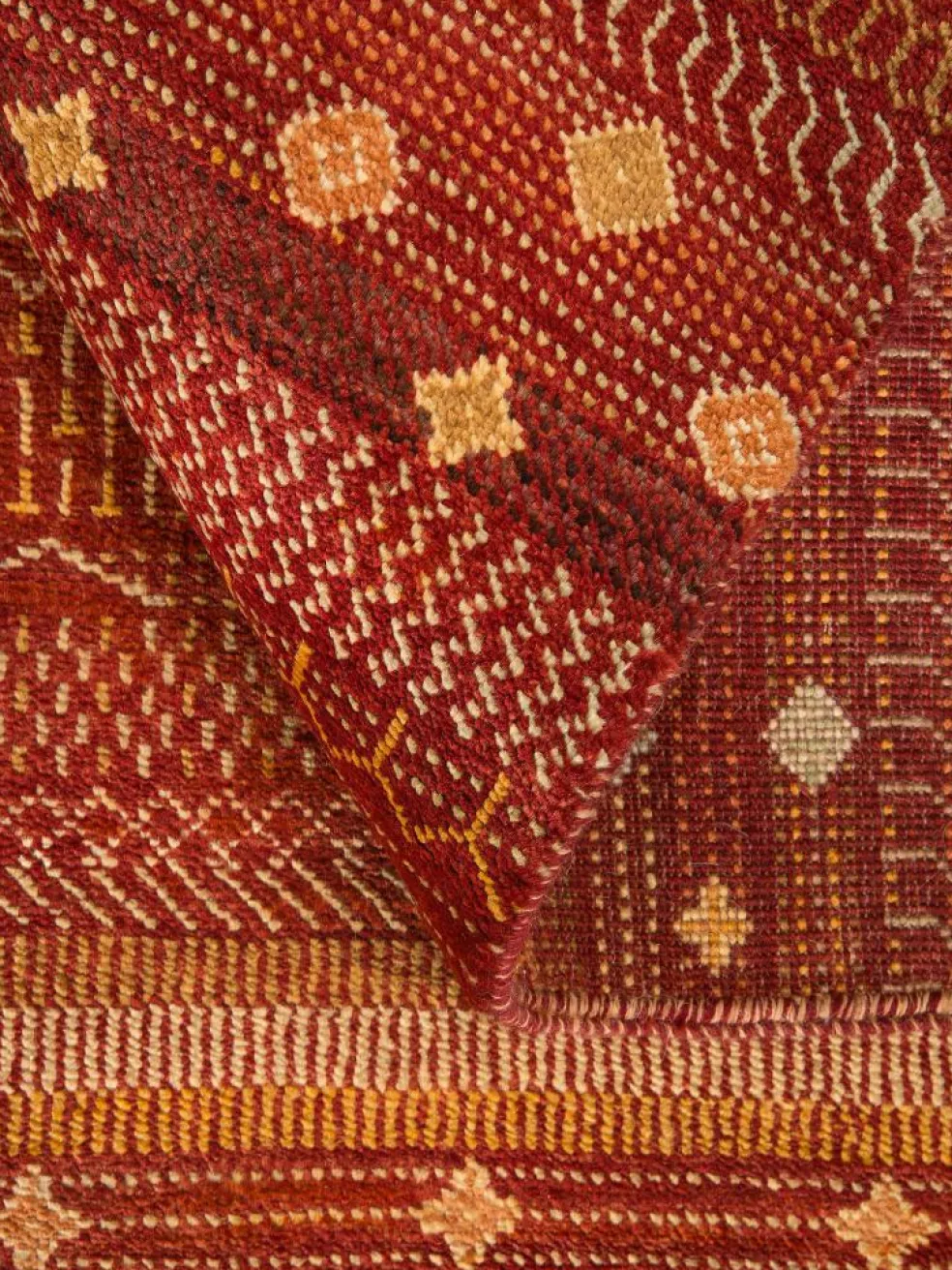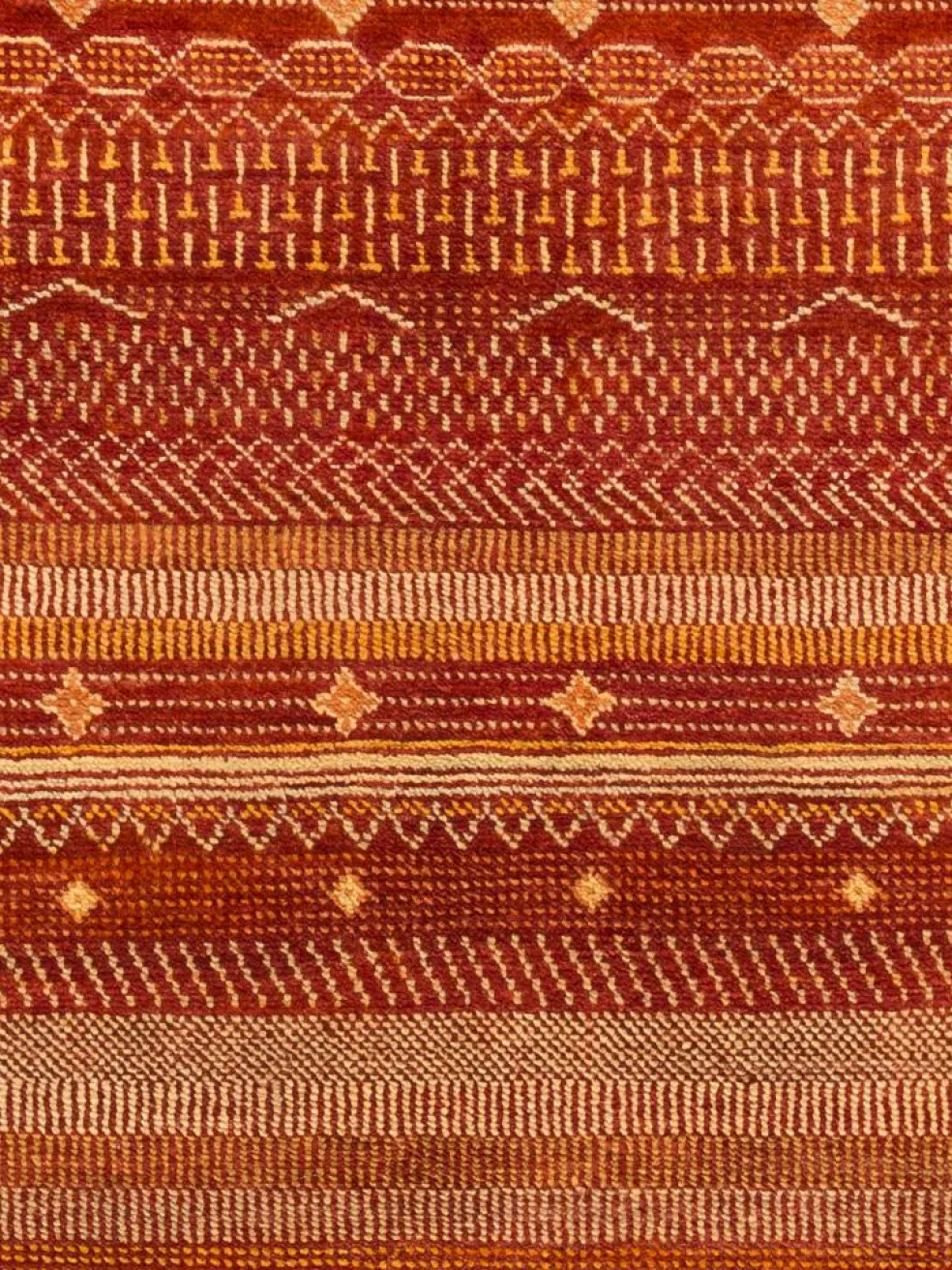 ist eine ungewöhnliche moderne Variation des traditionellen persichen Gabbehs. Er ist kürzer im Flor und feiner geknüpft. Es gibt zahllose Neukreationen in individuellen und einzigartigen Farben und Mustern.| Gesamthöhe: | ca. 10 mm |