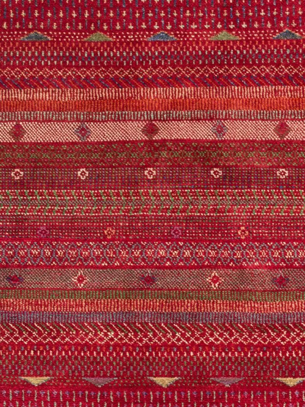 ist eine ungewöhnliche moderne Variation des traditionellen persichen Gabbehs. Er ist kürzer im Flor und feiner geknüpft. Es gibt zahllose Neukreationen in individuellen und einzigartigen Farben und Mustern. – Fein geknüpft inDouble-Knot