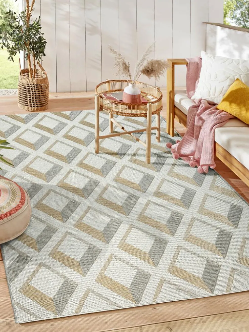 Dieser Outdoor-Teppich ist ein wahrer Eye-Catcher! Das strapazierfähige Flachgewebe hat einen raffinierten 3D-Effekt. Dank seiner schlichten Farbkombinationen und dem geometrischen Muster fügt er sich mühelos in eine moderne und elegante Einrichtung ein. Aus 100 % Polypropylen hergestellt, ist er besonders robust und leicht zu reinigen. Mit seinem einzigartigen Design und seiner hochwertigen Verarbeitung ist Effect die perfekte Wahl, um Ihrem Zuhause im Freien das gewisse Etwas zu verleihen.