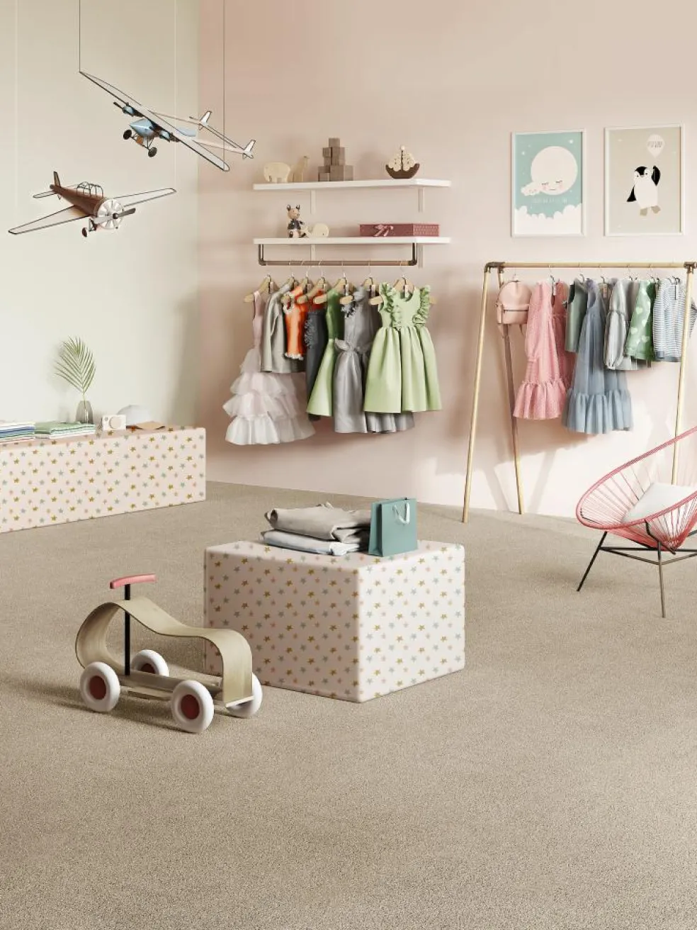 Dieser strapazierfähige Velours-Teppichboden mit dichtem, kurzem Flor vereint Komfort und Langelebigkeit. Die fleckenunempfindliche Oberfläche und das dezente Muster machen ihn ideal für Büro, Homeoffice oder Wohnbereiche. Fußbodenheizung geeignet.