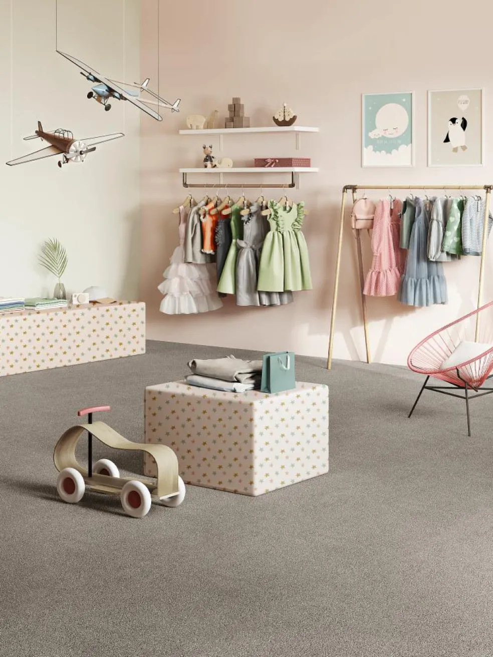 Dieser strapazierfähige Velours-Teppichboden mit dichtem, kurzem Flor vereint Komfort und Langelebigkeit. Die fleckenunempfindliche Oberfläche und das dezente Muster machen ihn ideal für Büro, Homeoffice oder Wohnbereiche. Fußbodenheizung geeignet.
