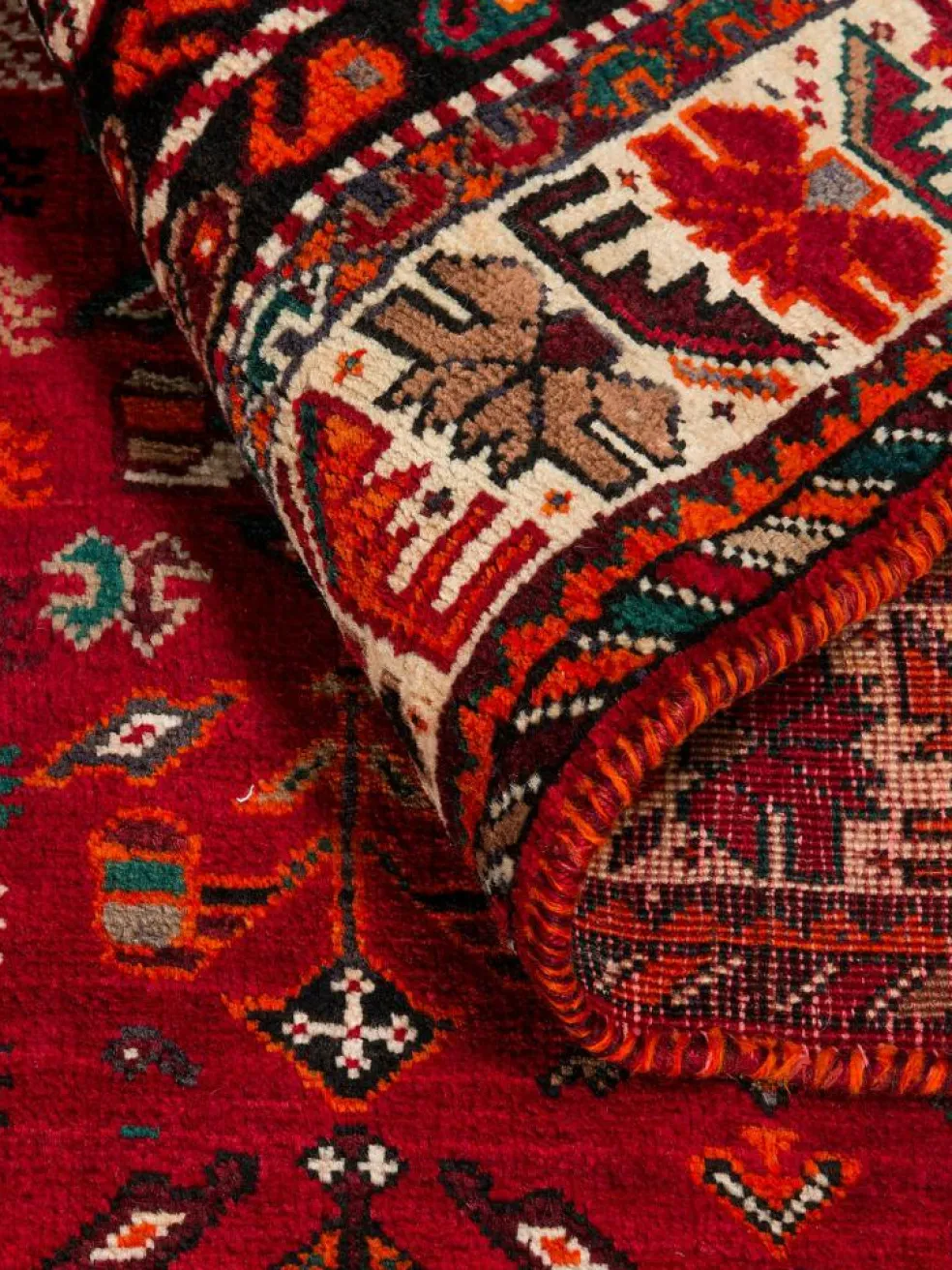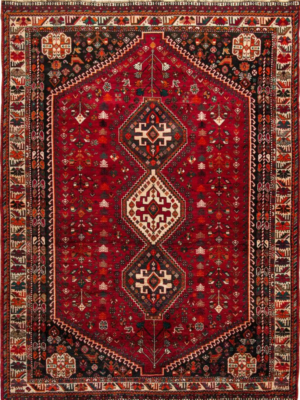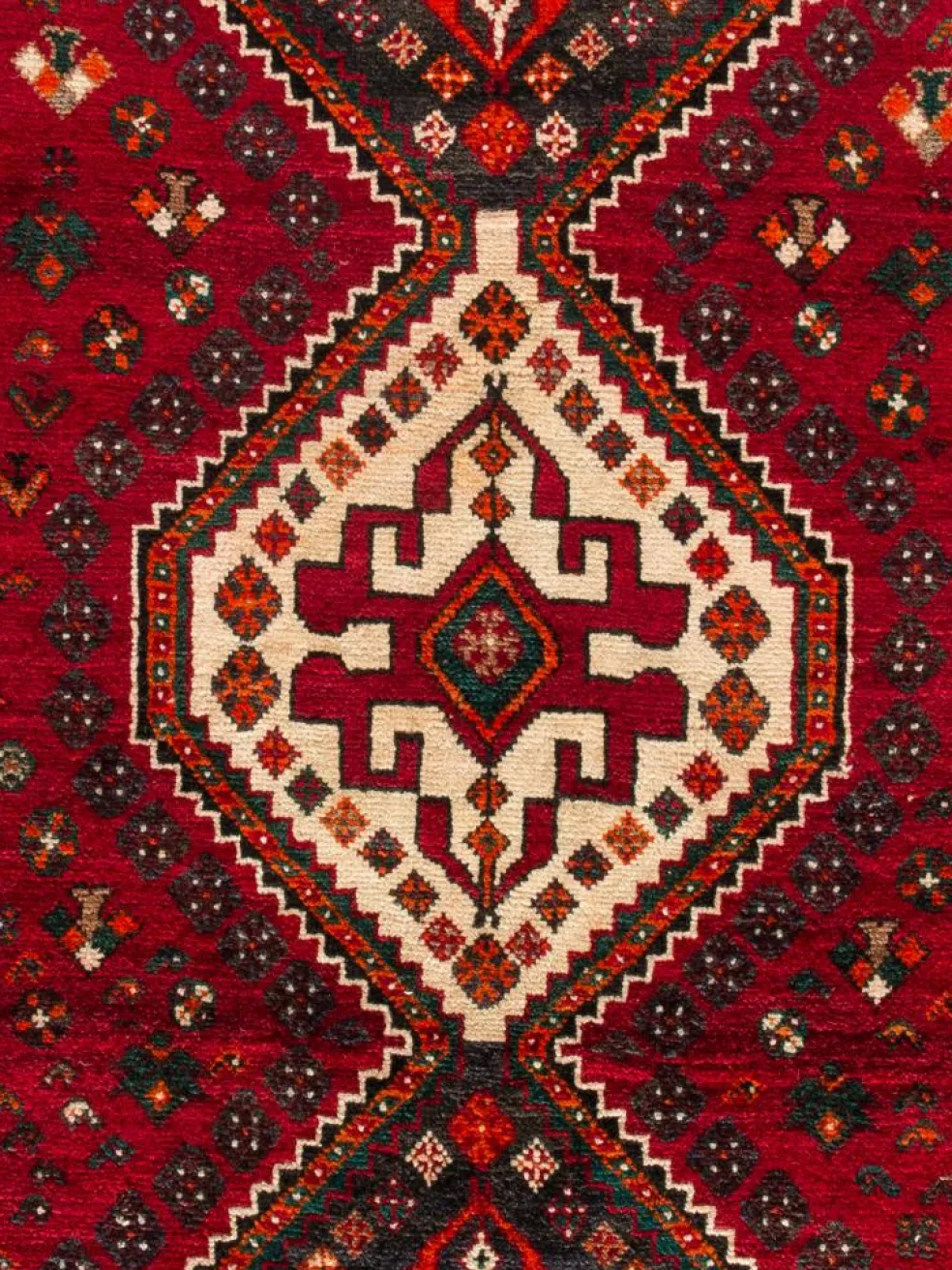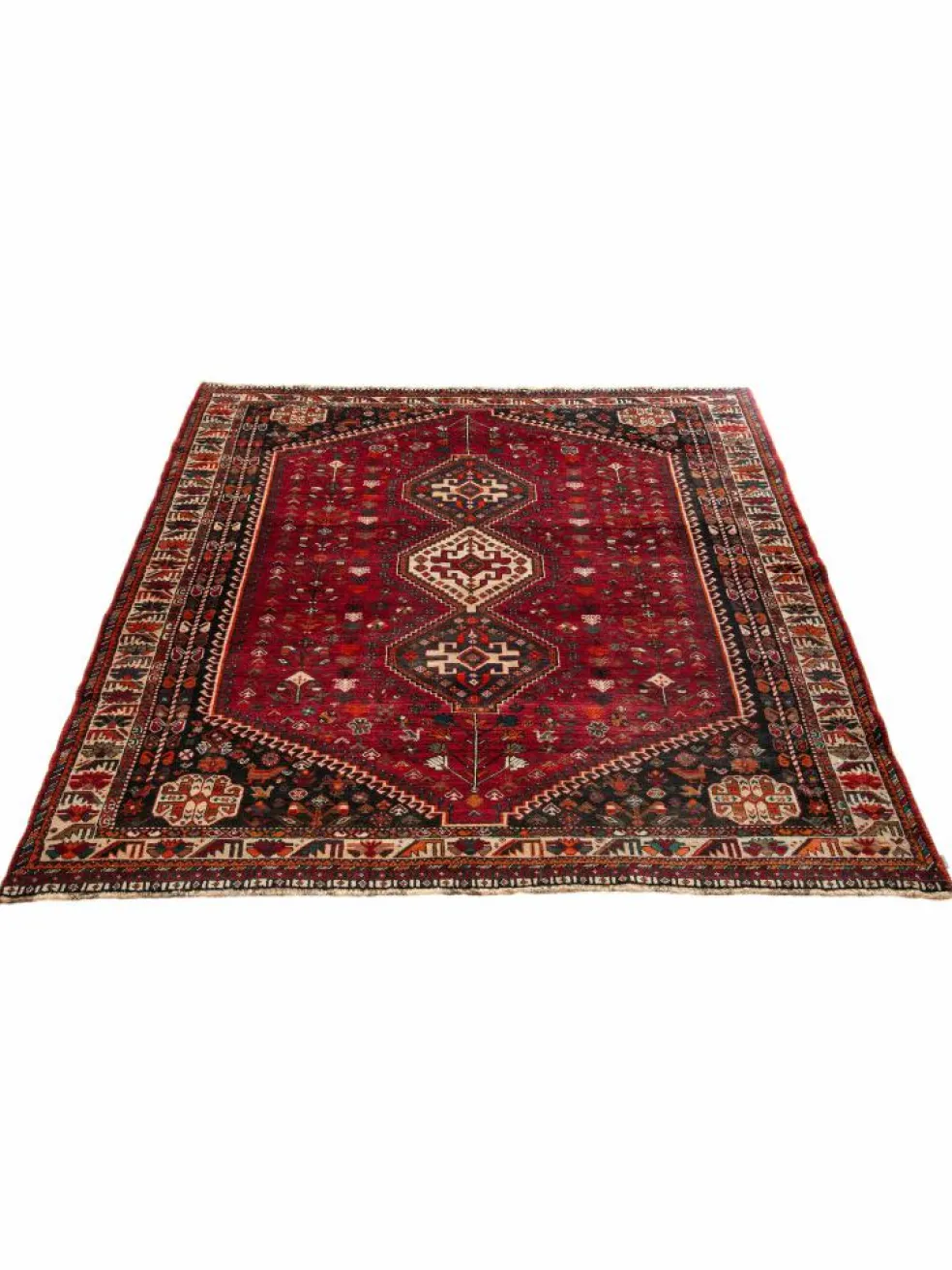 -Teppiche sind die Könige unter den Nomadenteppichen. Knüpfvorlagen gibt es bei den Ghashgai nicht. Die Knüpferinnen haben ein sehr gutes Gedächtnis. Sie brauchen ein interessantes Motiv nur einmal zu sehen oder erzählt zu bekommen. Alle Teppiche werden aus dem Gedächtnis geknüpft und sind daher nie gleich. Die Ornamente werden immer anders angeordnet oder die Farben unterscheiden sich. DasGrundgewebe
