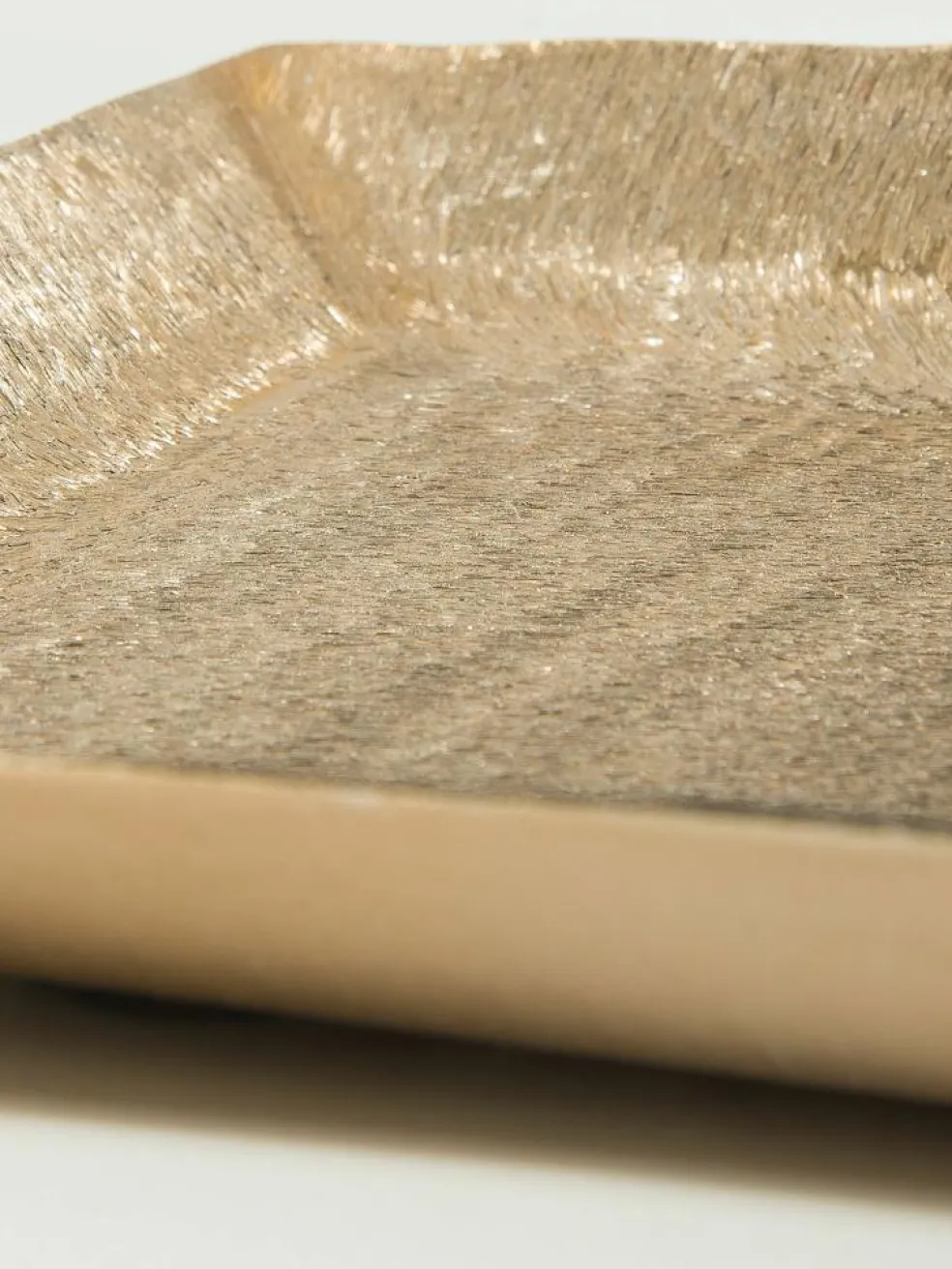 Kunstvoll gestaltete Deko-Tabletts aus Aluminium, mit handgefertigten Hammerschlag in Mattgold-Finish.