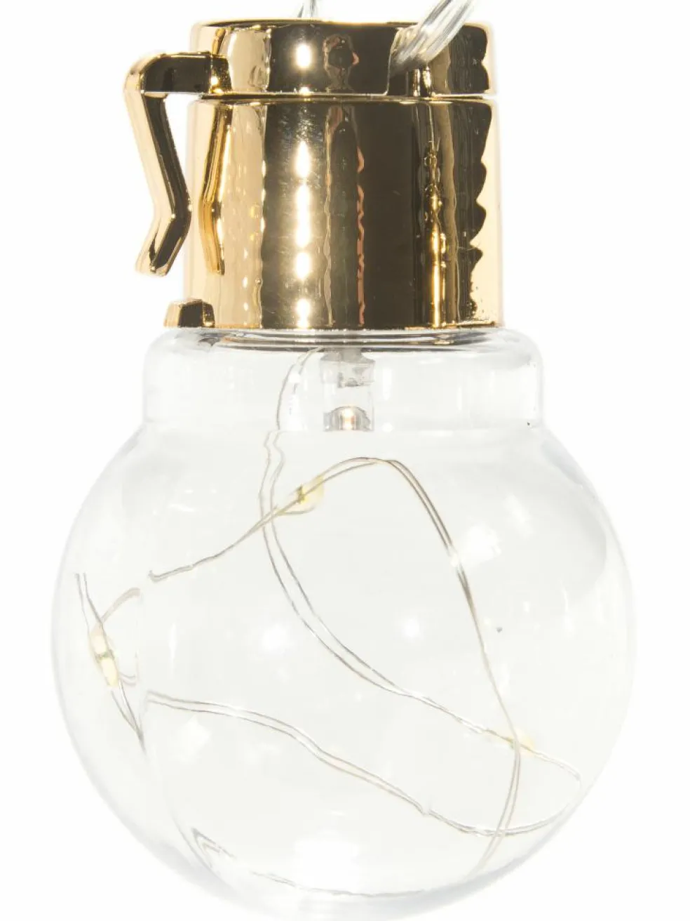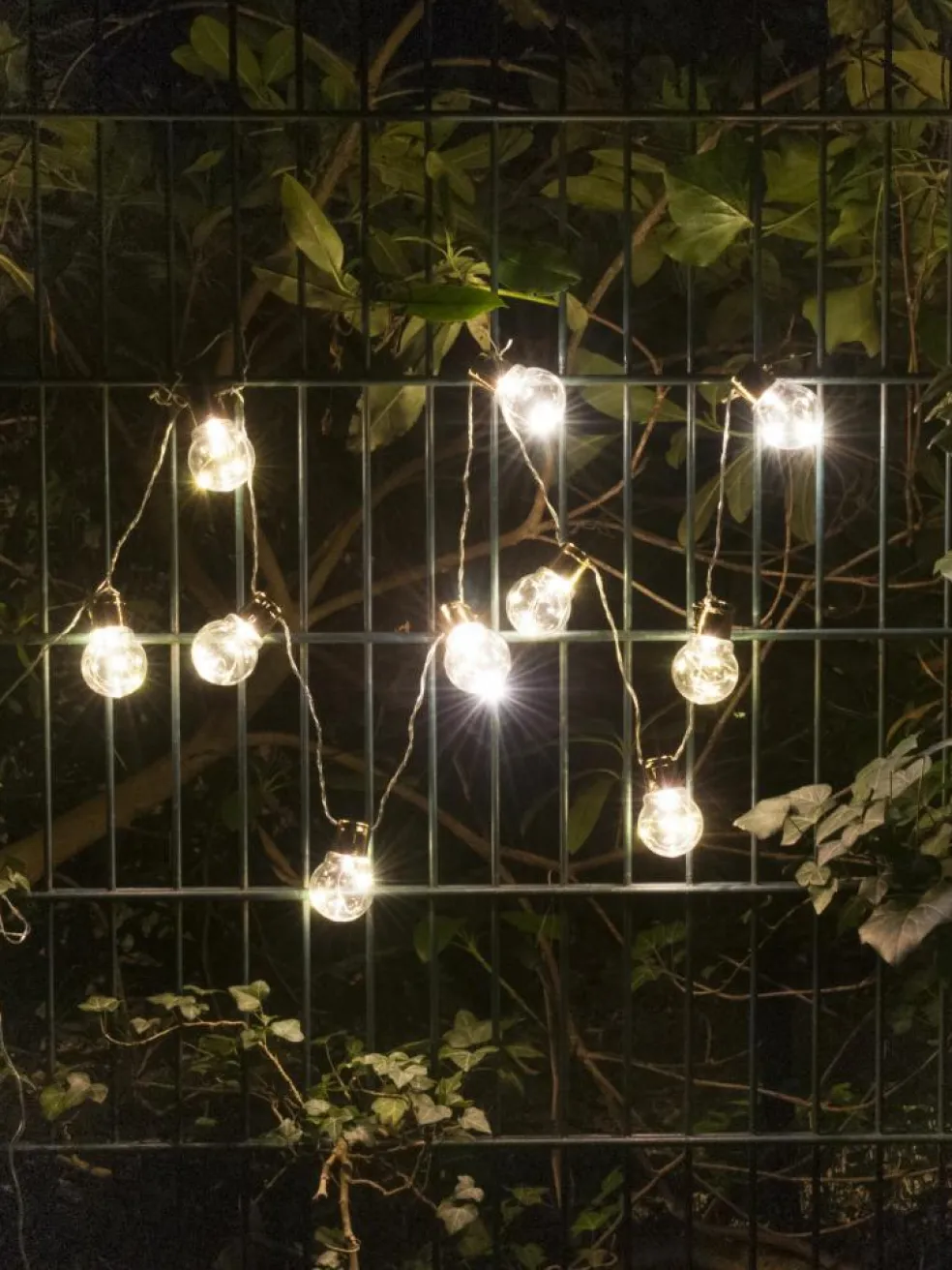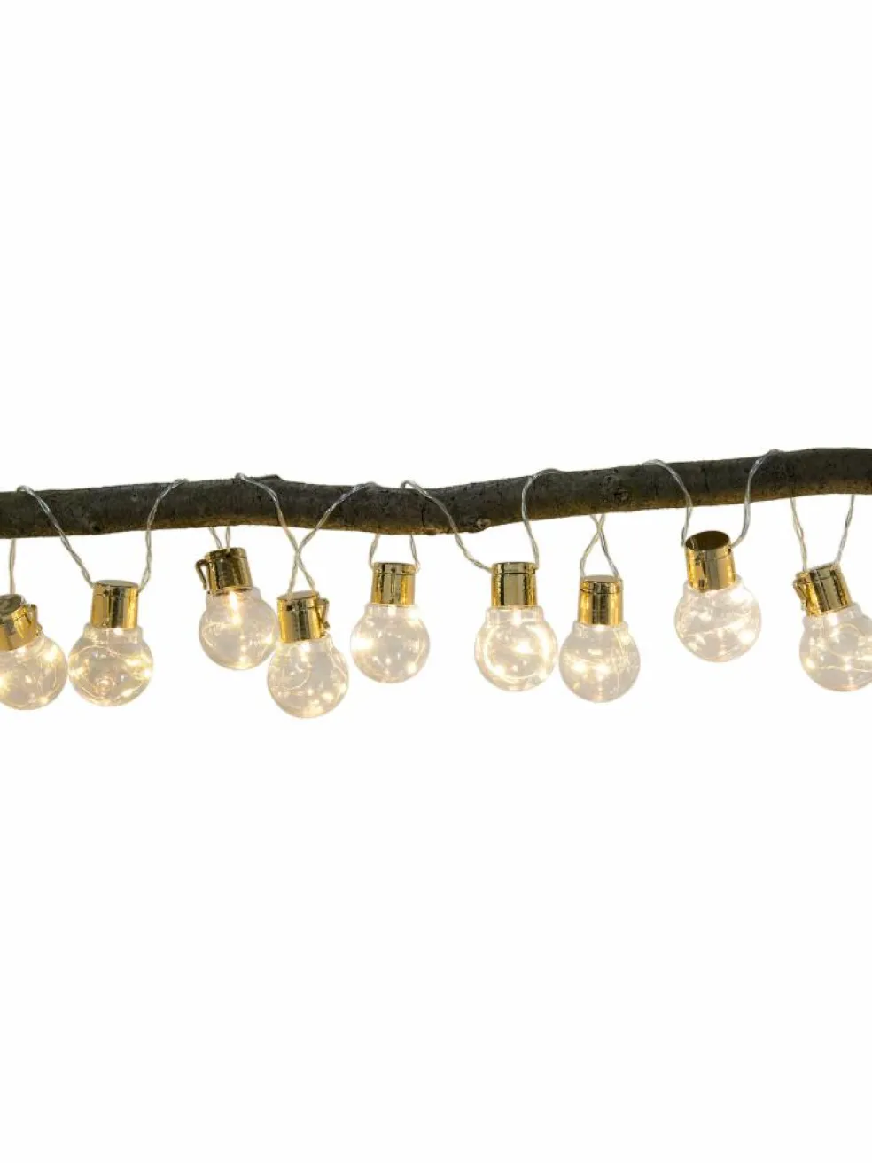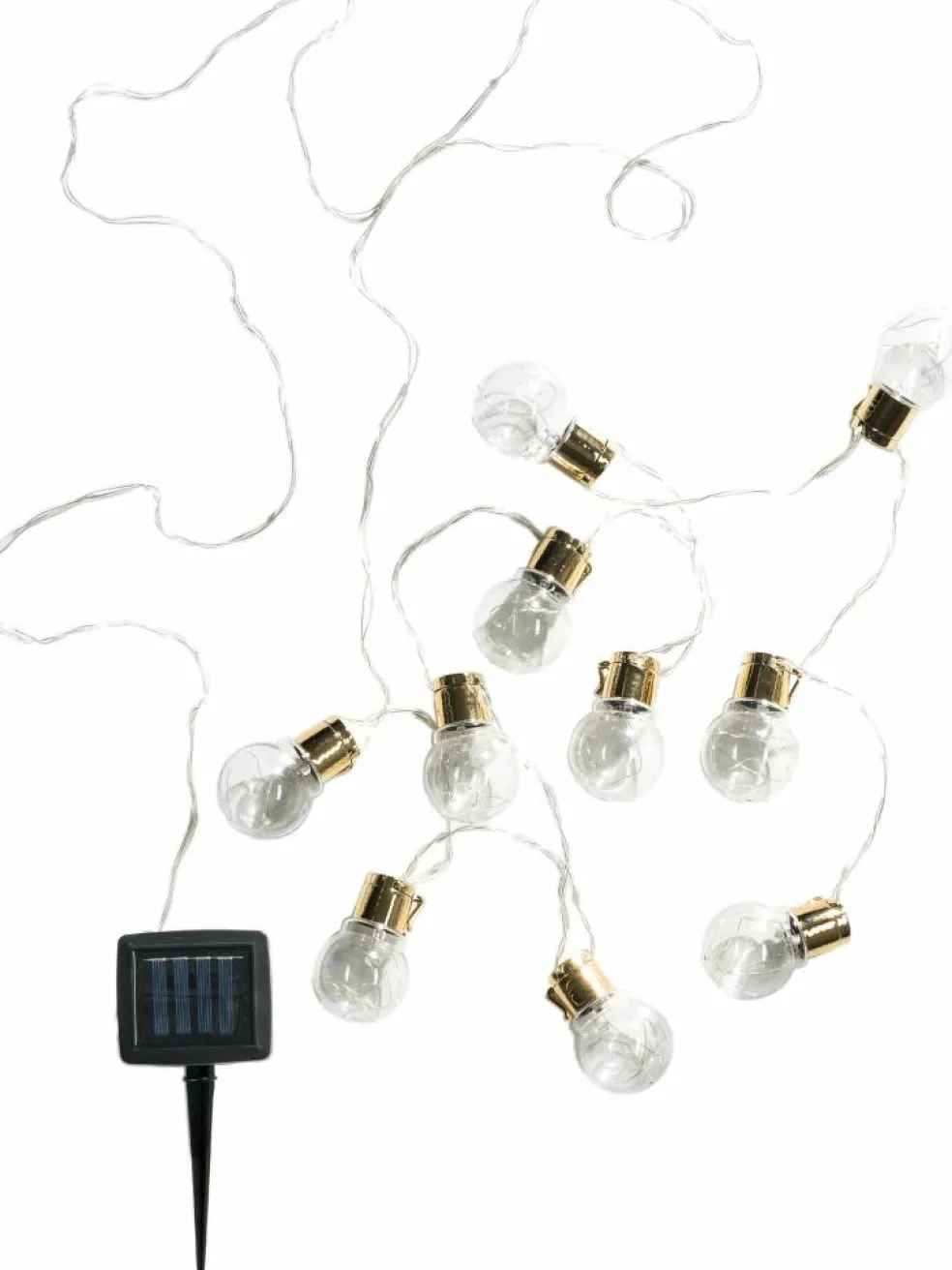 Die Solar Lichterkette besteht aus transparenten Glühbirnen mit goldfarbenen Elementen, welche für einen edlen Look sorgen. Pro Lichterkette gibt es 10 LED Glühbirnen, bei einer Kabellänge von 2m.