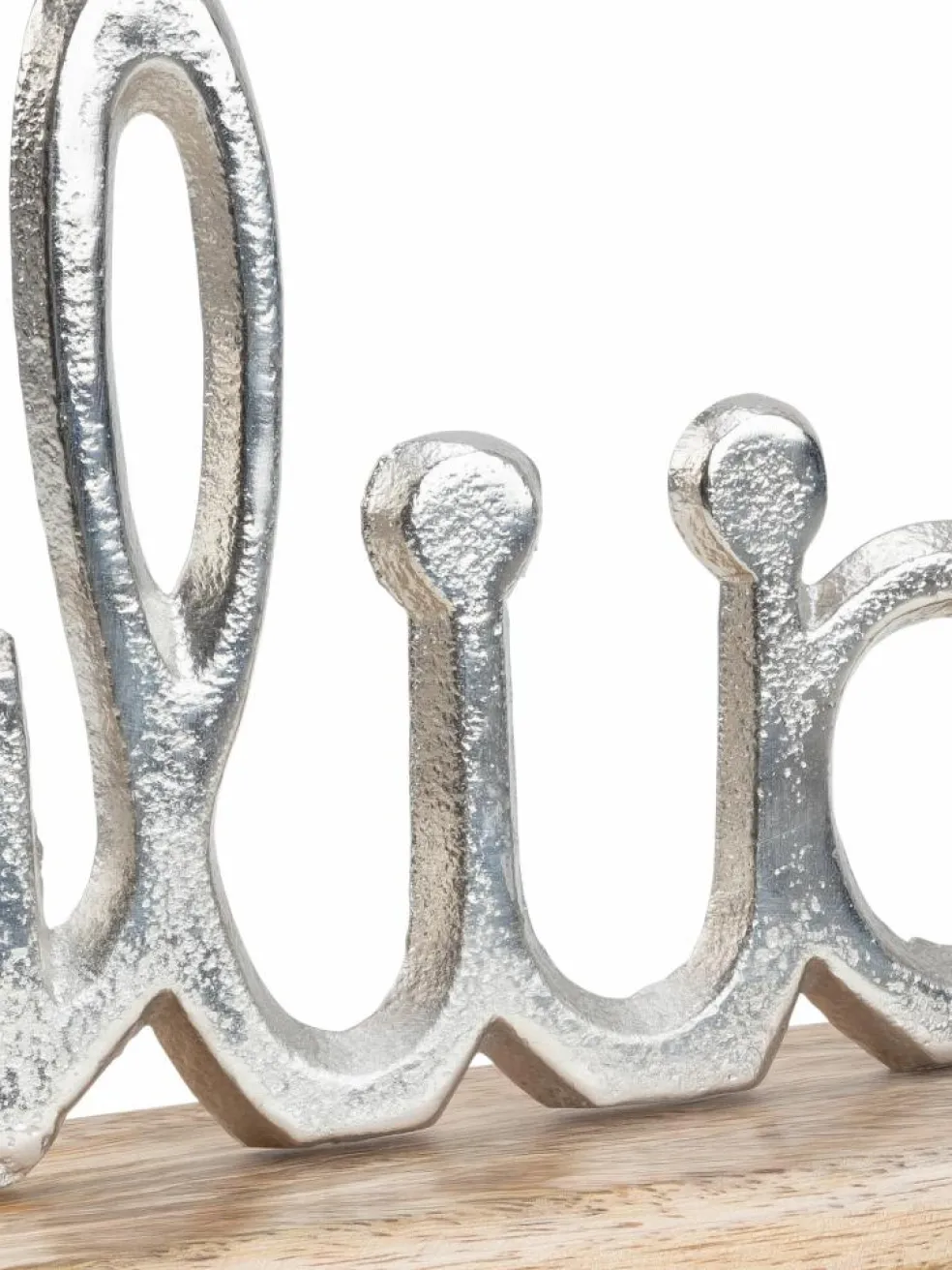 So zieht das Glück zuhause ein! Der schlichte, aus Aluminium gefertigte Schriftzug steht auf hochwertigem Mangoholz und wurde pulverbeschichtet.