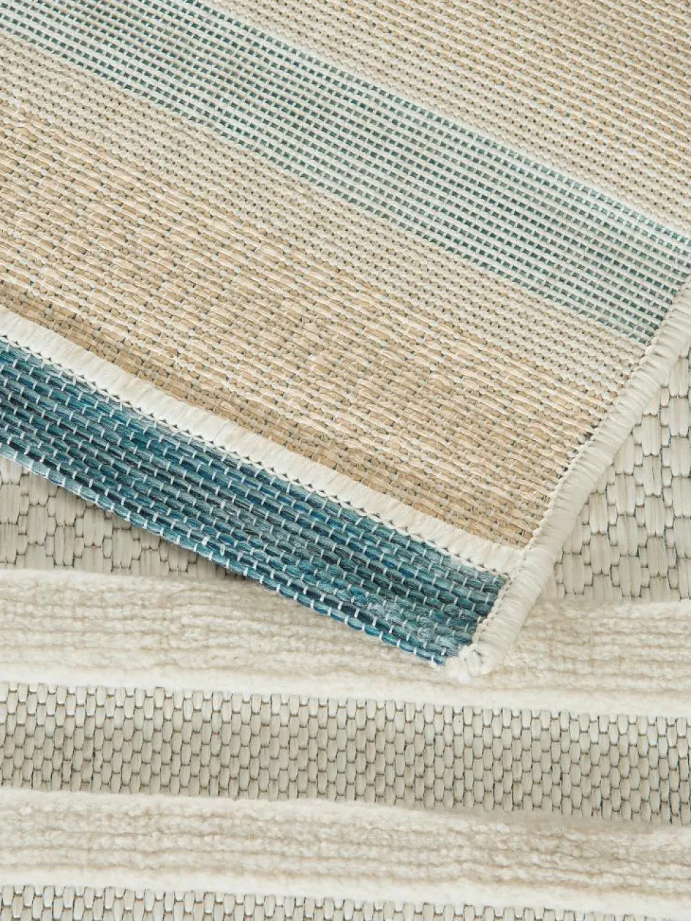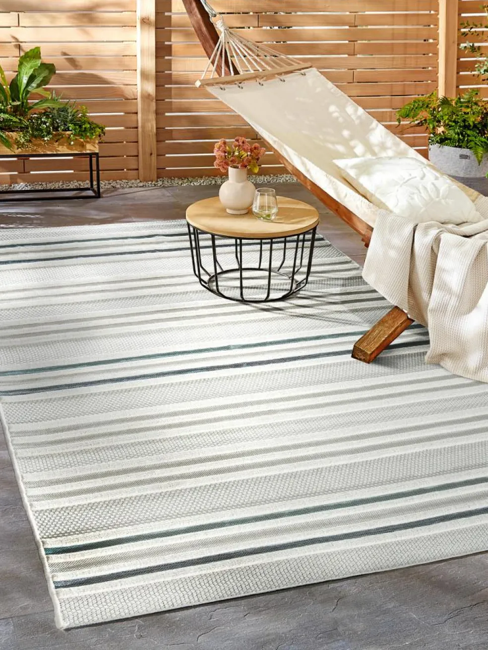Ein besonderes Highlight für Liebhaber der maritimen Einrichtung ist der Hovetorp. Mit seiner tollen Hoch-Tief-Struktur und der Streifenoptik in dezenten Farbkombinationen ist er nicht nur vielseitig einsetzbar, sondern überzeugt auch mit einer besonderen Haptik. Hergestellt aus 100 % Polyester, mit einem Gewicht von 1.200 g pro m² ist er besonders strapazierfähig und hält den Witterungsbedingungen auf Terrasse oder Balkon mühelos stand. Ein Outdoor-Teppich, der zu fast jedem Geschmack passt!