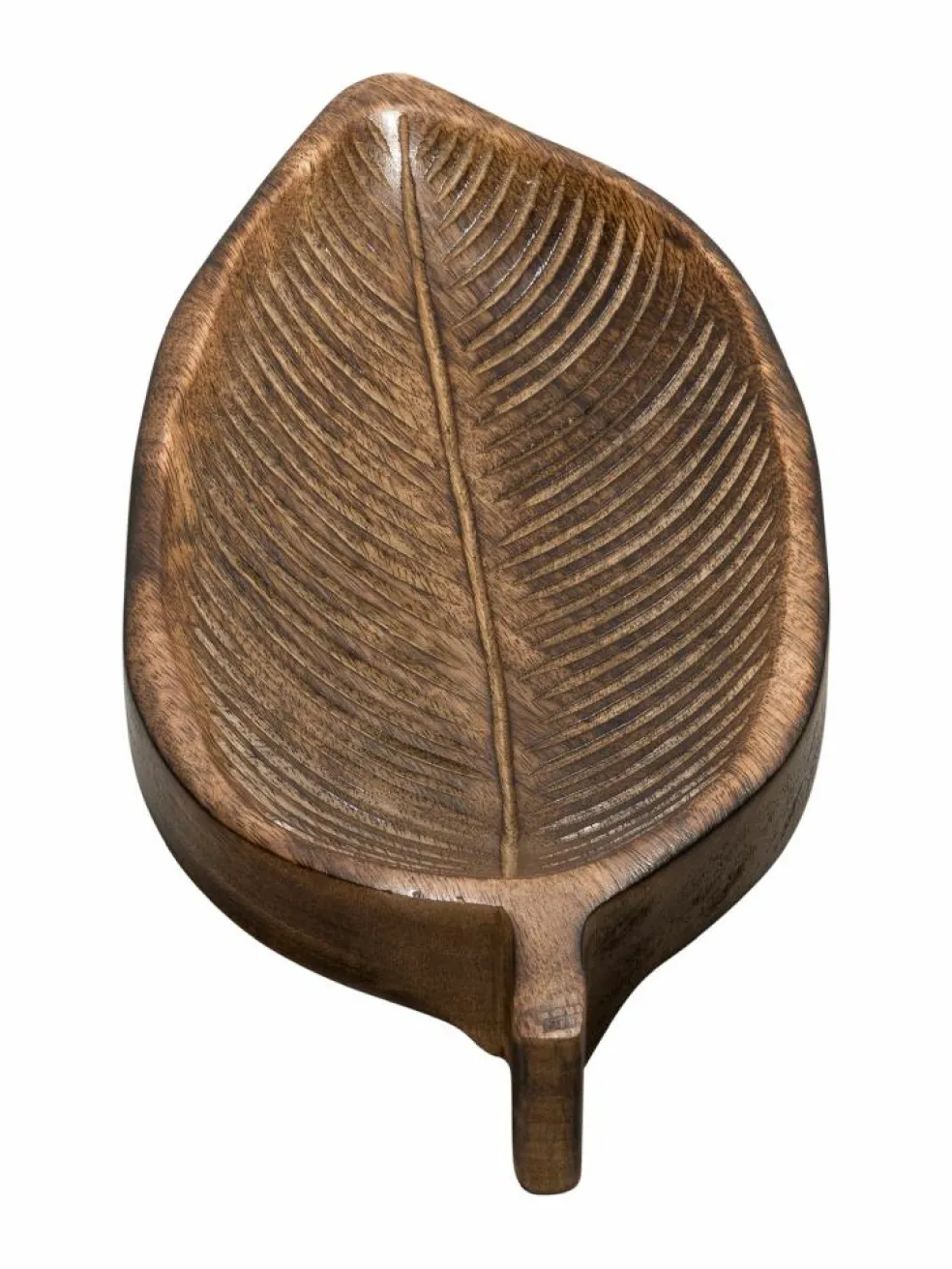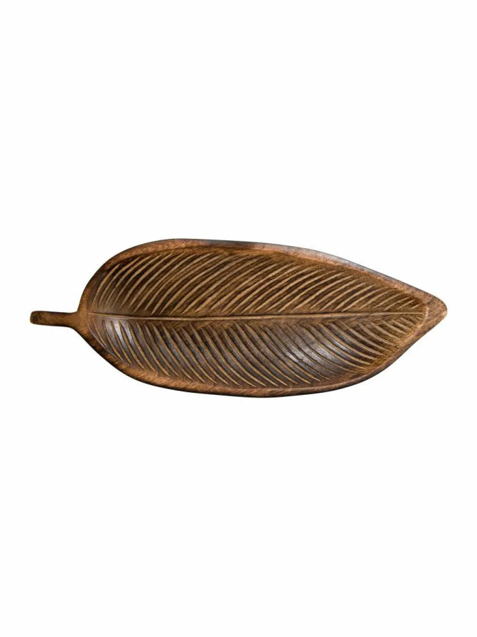 Bringen Sie natürliche Eleganz in jeden Raum. Das vielseitig verwendbare Tablett in Blattform ist nicht nur funktional, sondern auch ein Eyecatcher für jeden Wohnbereich. Das hochwertige Material aus robustem Mangoholz ist verziert mit fein eingearbeiteten Strukturen.