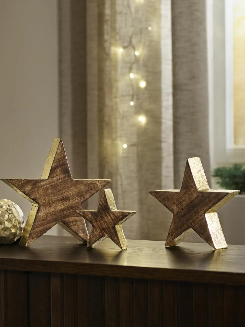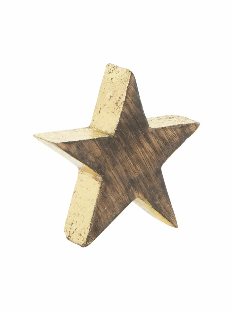 Karja ist ein moderner Stern-Aufsteller, der besonders zur Weihnachtszeit eine tolle Figur macht. Das dunkelbraune Mangoholz wird durch die goldene Folierung an den Außenkanten besonders hervorgehoben.