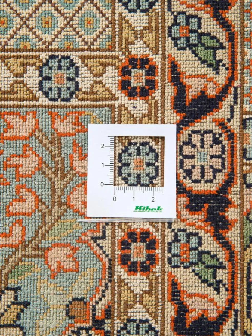 -Teppiche sind eher zurückhaltend, die Muster nach wie vor sehr stark persisch beeinflusst. Florale Motive und das persischeFeldermuster