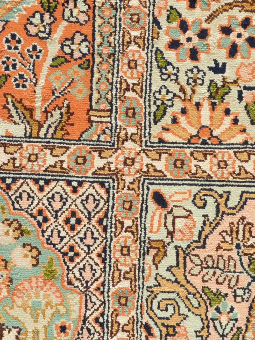 -Teppiche sind eher zurückhaltend, die Muster nach wie vor sehr stark persisch beeinflusst. Florale Motive und das persischeFeldermuster
