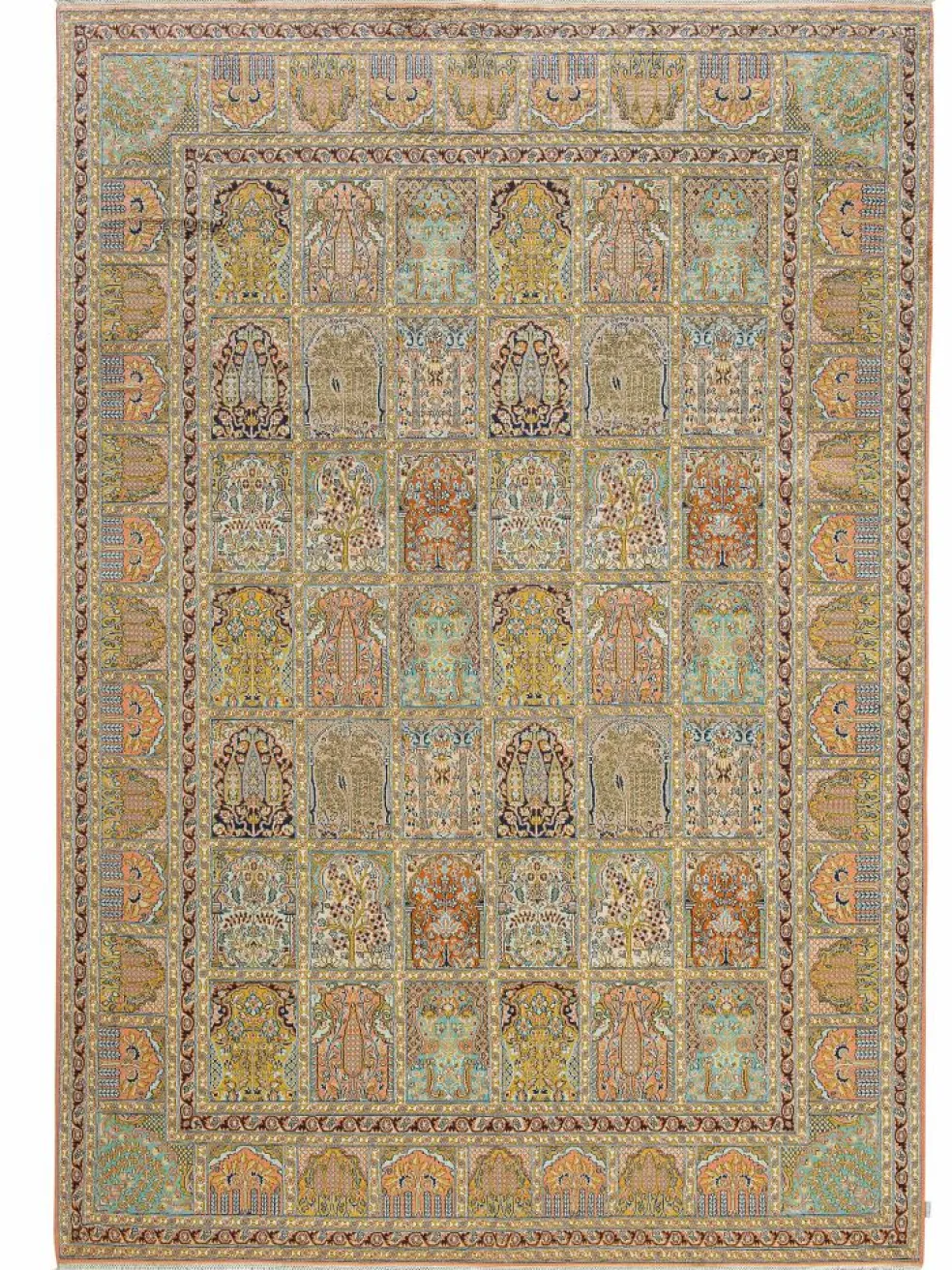 -Teppiche sind eher zurückhaltend, die Muster nach wie vor sehr stark persisch beeinflusst. Florale Motive und das persischeFeldermuster