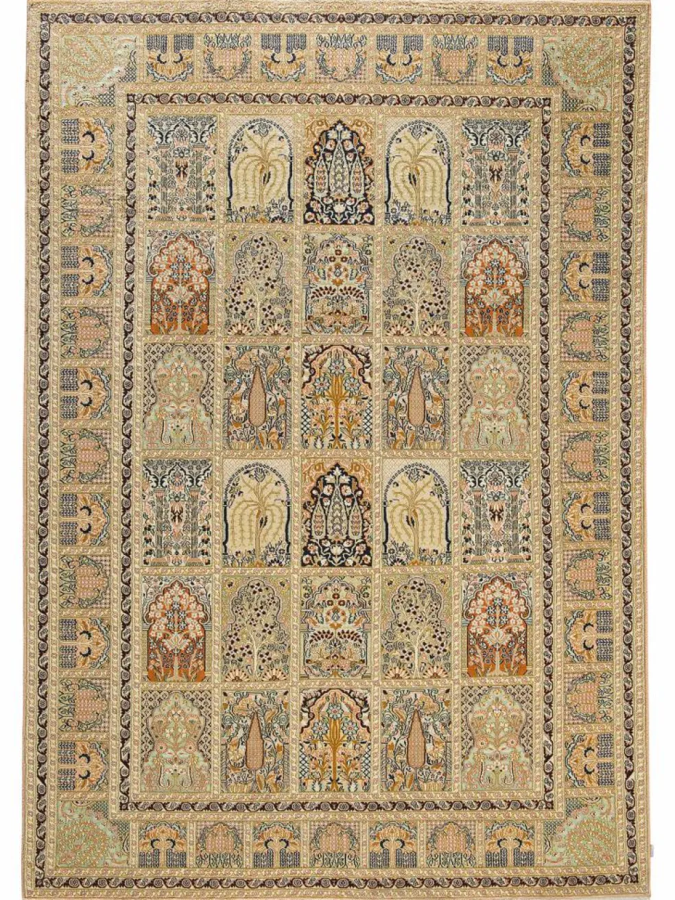 -Teppiche sind eher zurückhaltend, die Muster nach wie vor sehr stark persisch beeinflusst. Florale Motive und das persischeFeldermuster