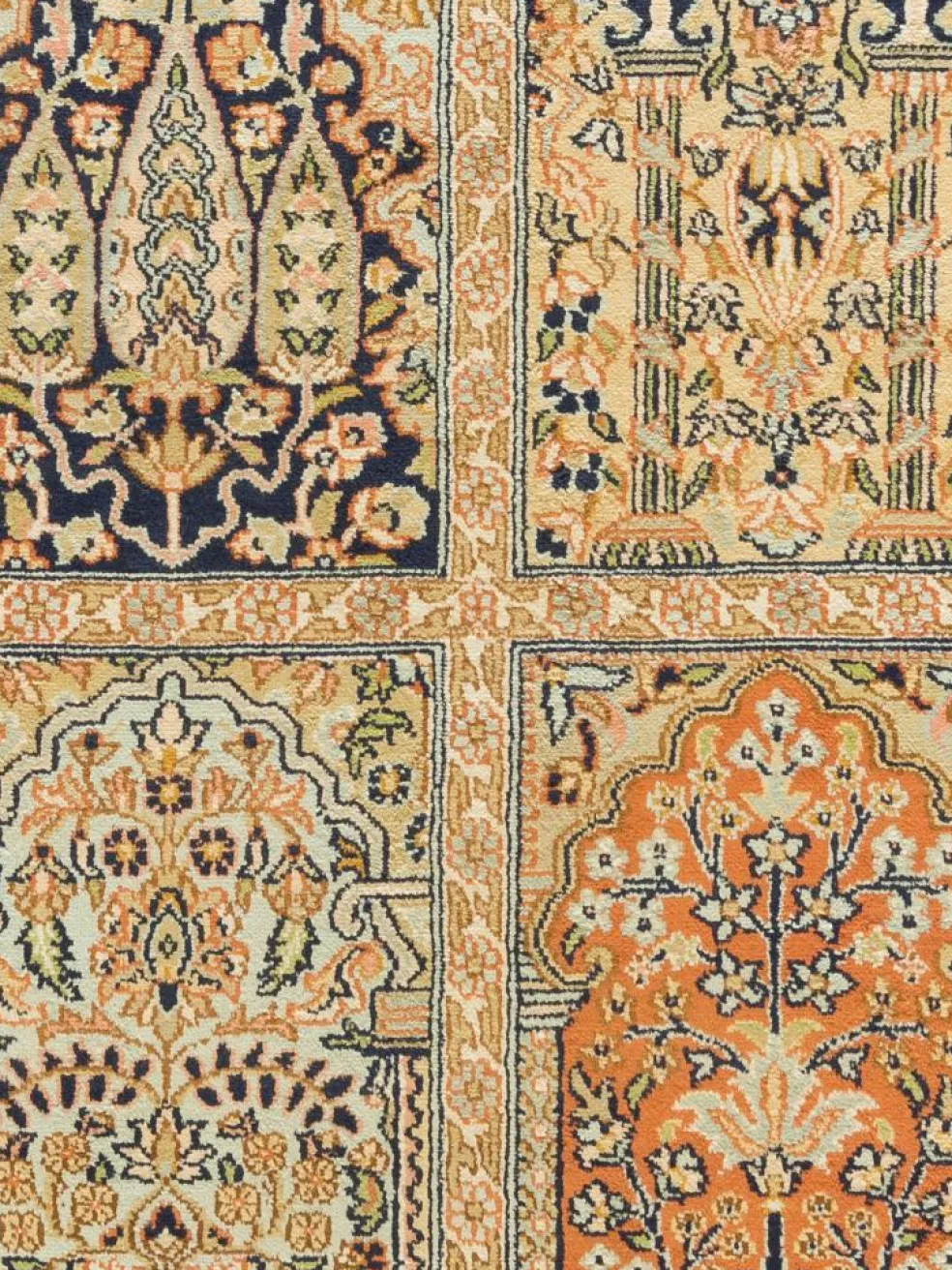 -Teppiche sind eher zurückhaltend, die Muster nach wie vor sehr stark persisch beeinflusst. Florale Motive und das persischeFeldermuster