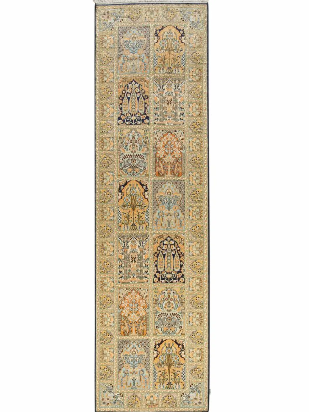 -Teppiche sind eher zurückhaltend, die Muster nach wie vor sehr stark persisch beeinflusst. Florale Motive und das persischeFeldermuster
