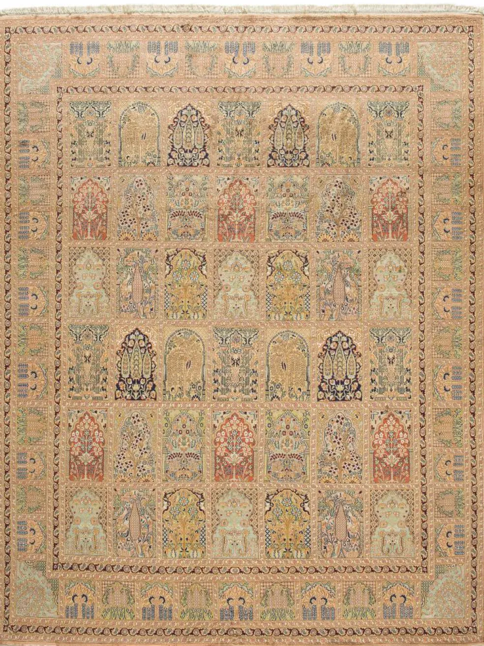 -Teppiche sind eher zurückhaltend, die Muster nach wie vor sehr stark persisch beeinflusst. Florale Motive und das persischeFeldermuster