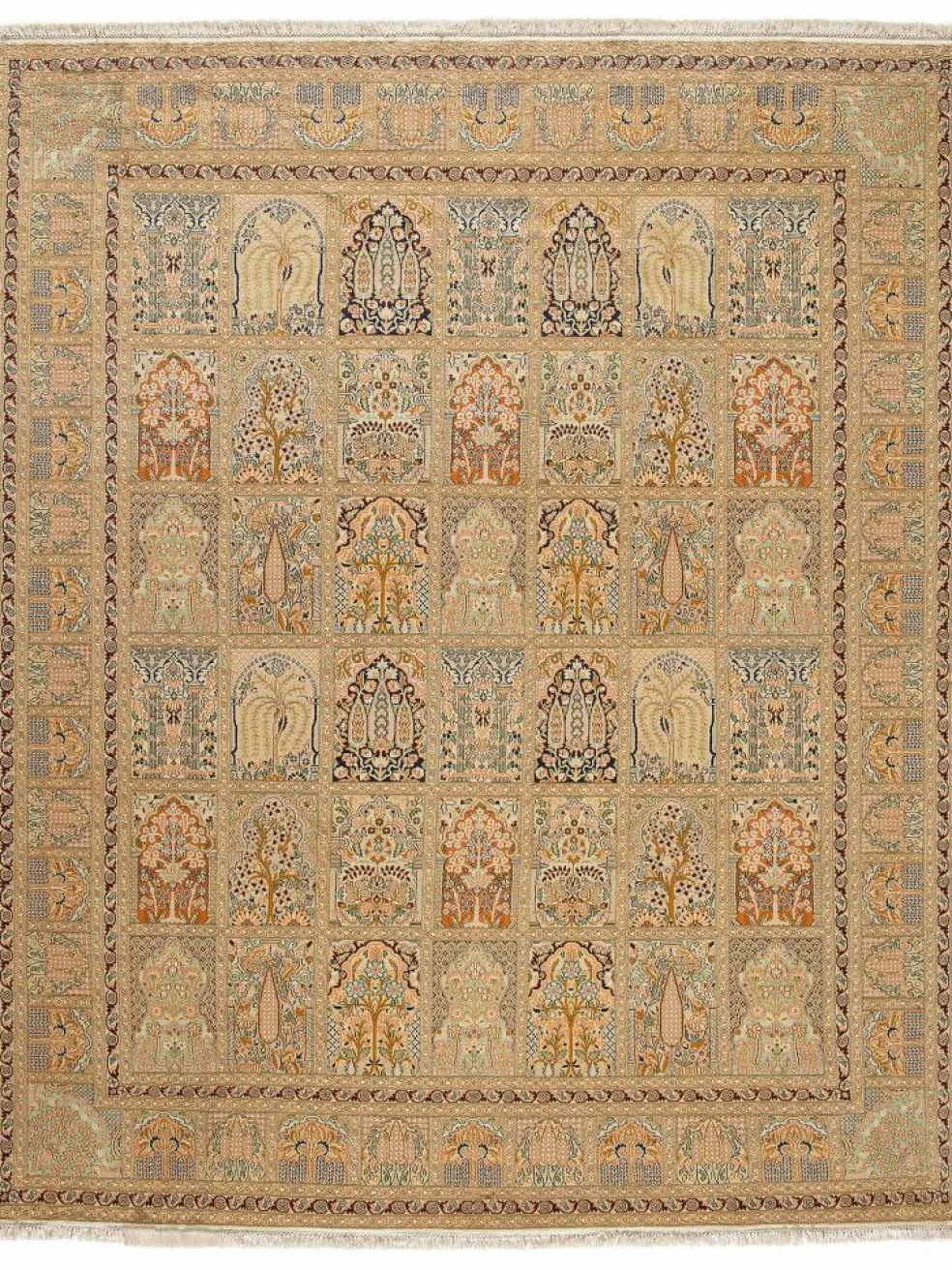 -Teppiche sind eher zurückhaltend, die Muster nach wie vor sehr stark persisch beeinflusst. Florale Motive und das persischeFeldermuster