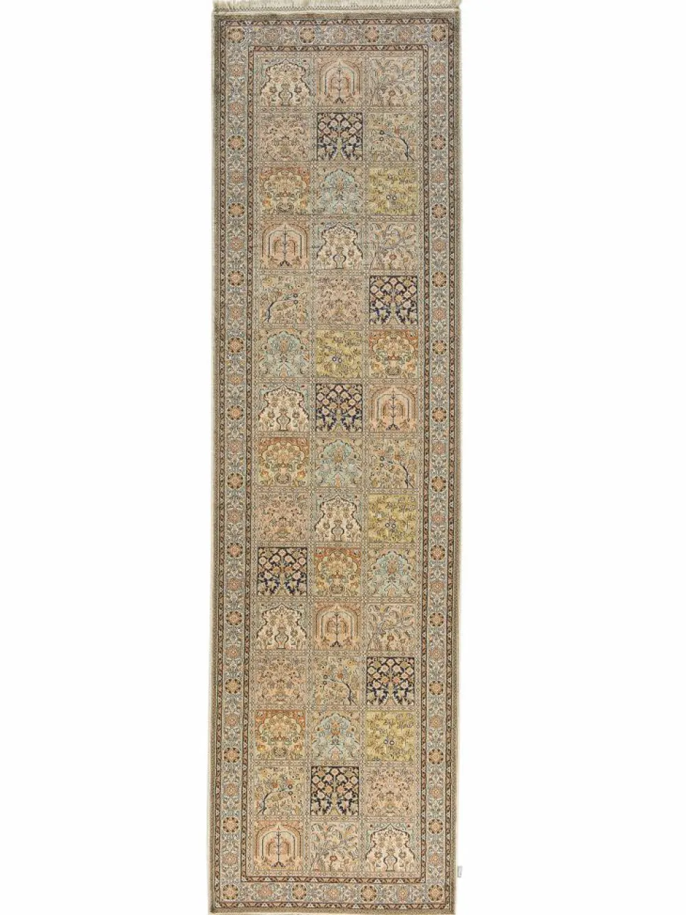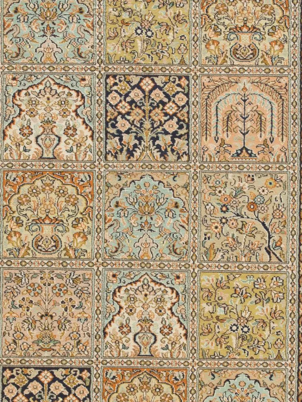-Teppiche sind eher zurückhaltend, die Muster nach wie vor sehr stark persisch beeinflusst. Florale Motive und das persischeFeldermuster
