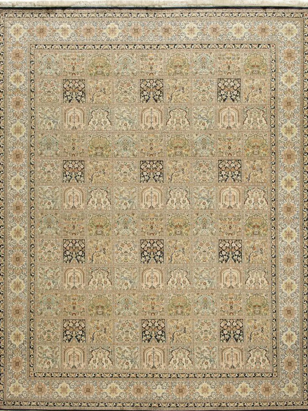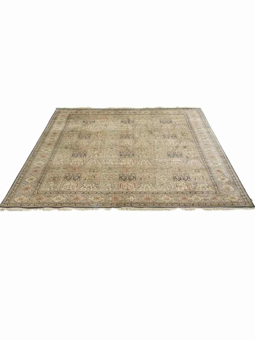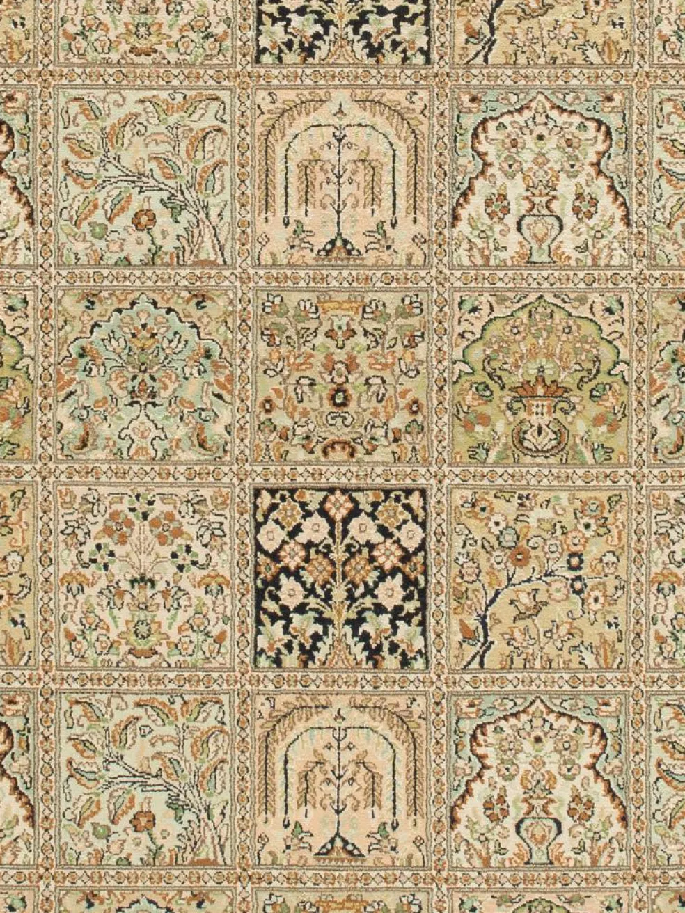 -Teppiche sind eher zurückhaltend, die Muster nach wie vor sehr stark persisch beeinflusst. Florale Motive und das persischeFeldermuster