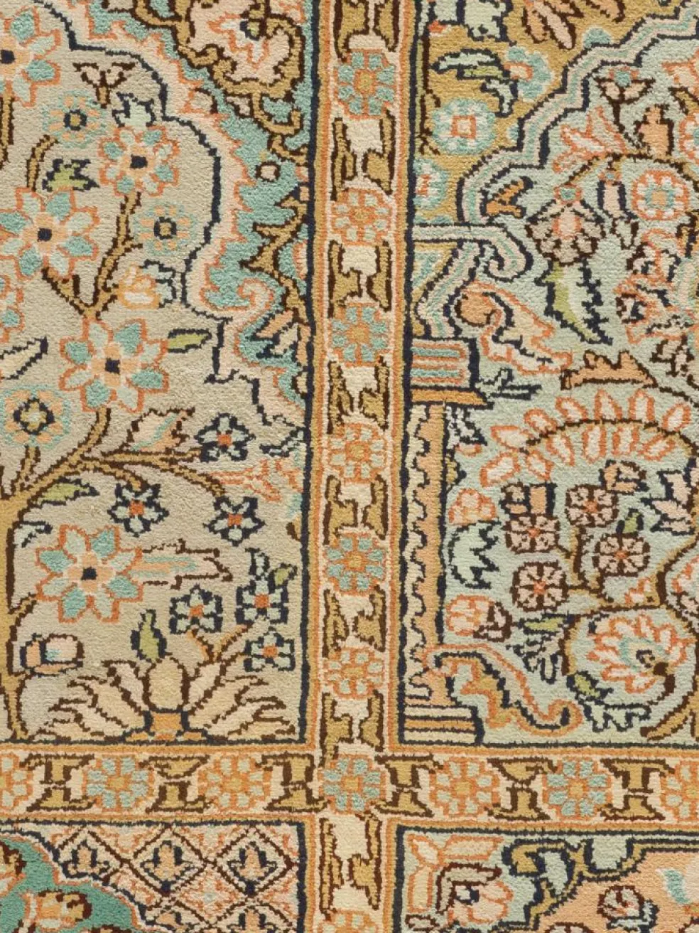 -Teppiche sind eher zurückhaltend, die Muster nach wie vor sehr stark persisch beeinflusst. Florale Motive und das persischeFeldermuster
