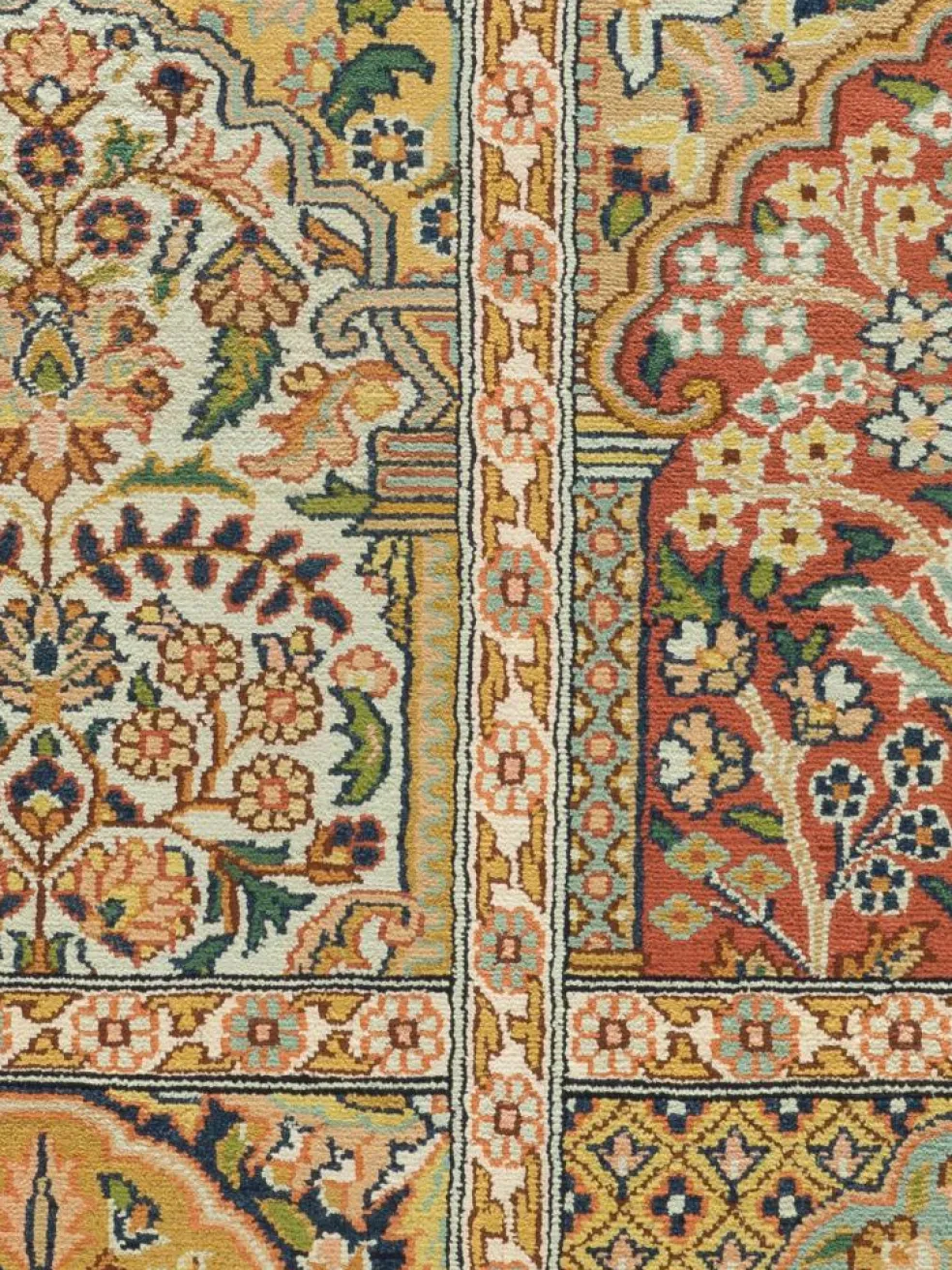 -Teppiche sind eher zurückhaltend, die Muster nach wie vor sehr stark persisch beeinflusst. Florale Motive und das persischeFeldermuster