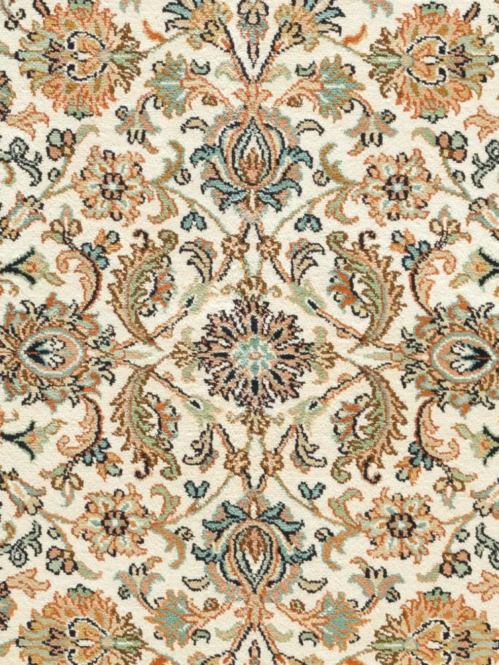 -Teppiche sind eher zurückhaltend, die Muster nach wie vor sehr stark persisch beeinflusst. Florale Motive und das persischeFeldermuster