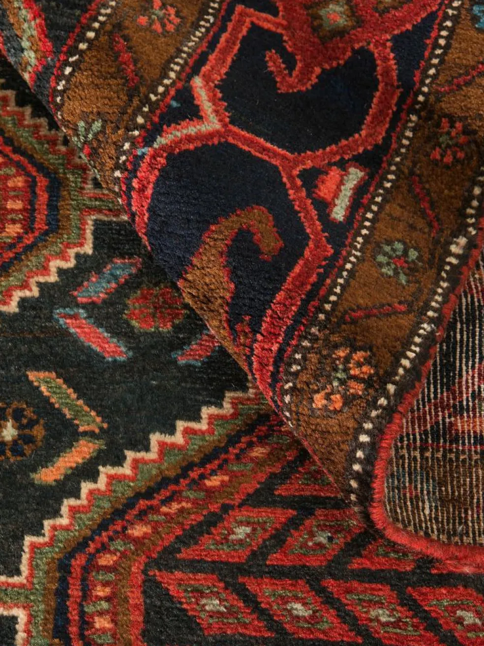 finden sich die unterschiedlichsten Dessins anderer Provenienzen, die in einer kurdentypischen Art und Weise, in völlig anderen Farben, geknüpft werden. Meist ist die Farbgebung der Teppiche eher dunkel. Der hohe Flor ist aus guter Bergschafwolle und besonders haltbar.| Gesamthöhe: | ca. 11 mm |