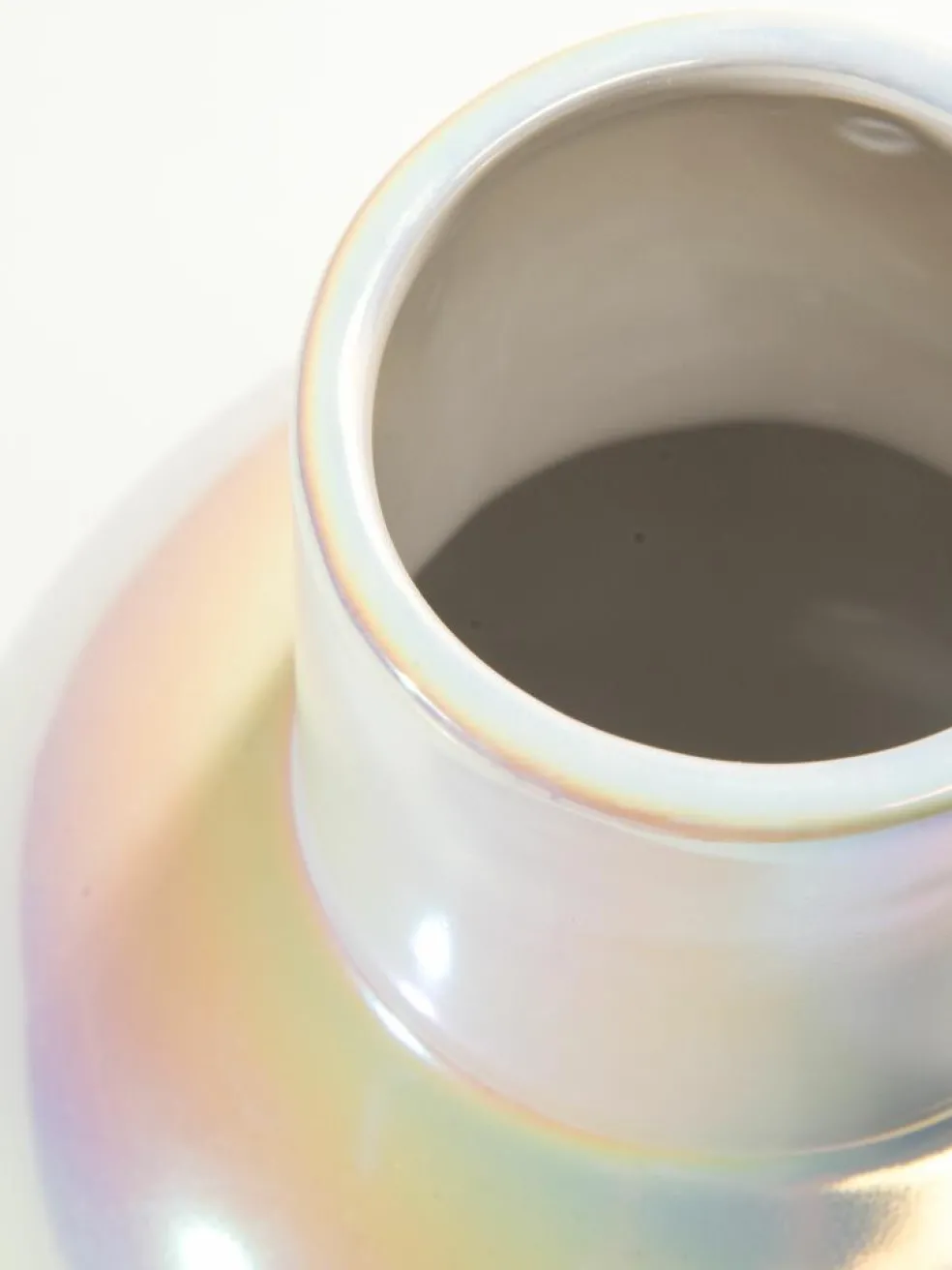 Vase in Bellyform aus Keramik mit einer schimmernden Perlmutt-Optik, die für einen leichten farblichen Akzent sorgt.
