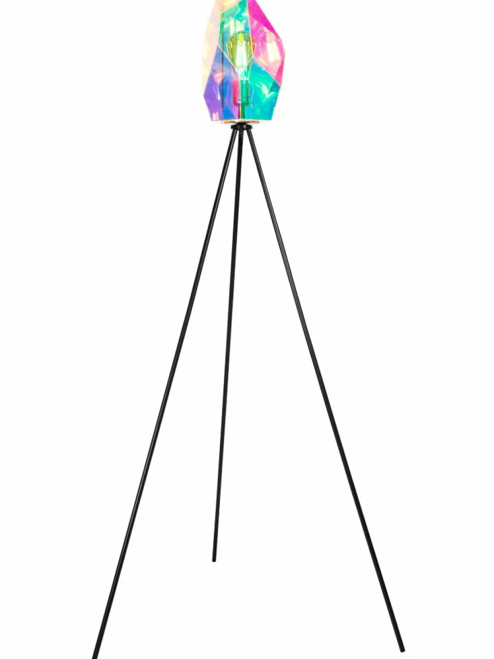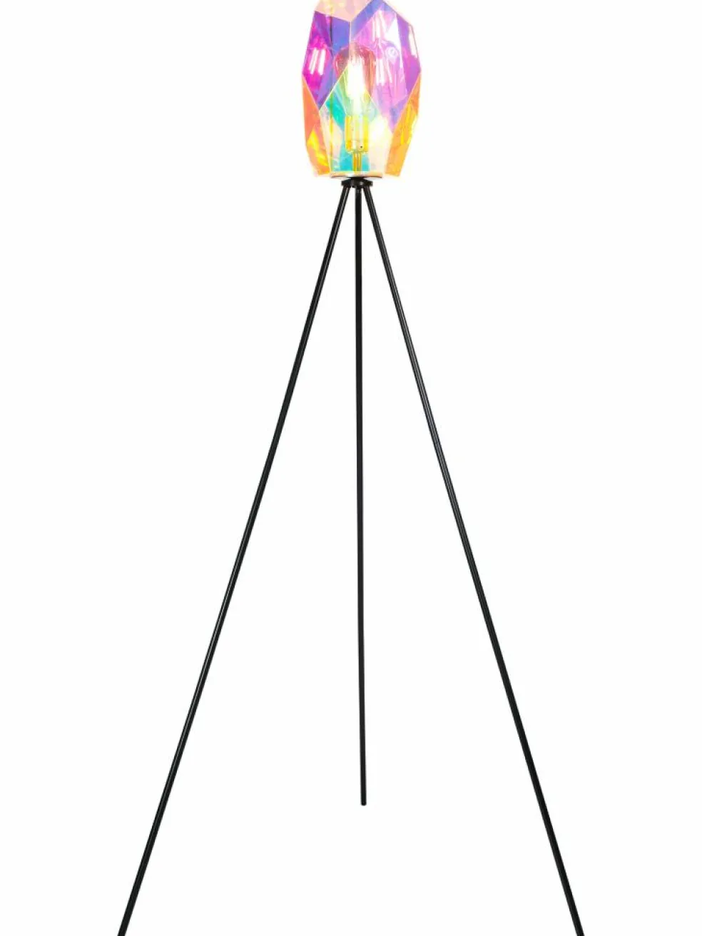 Die Stehlampe hat einen Lampenschirm in wunderschöner Kristallform, welcher das Licht wie ein Prisma streut. Durch das bunt schillernde, transparente Acryl verändert sich die Farbe aus jedem Blickwinkel. Schwarzes Textilkabel mit Kippschalter. Zu verwendende Leuchtmittel (nicht inklusive): E27, max. 4W LED.
