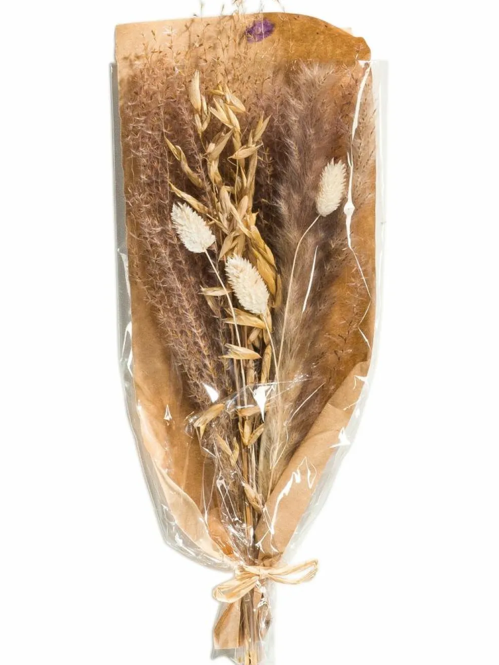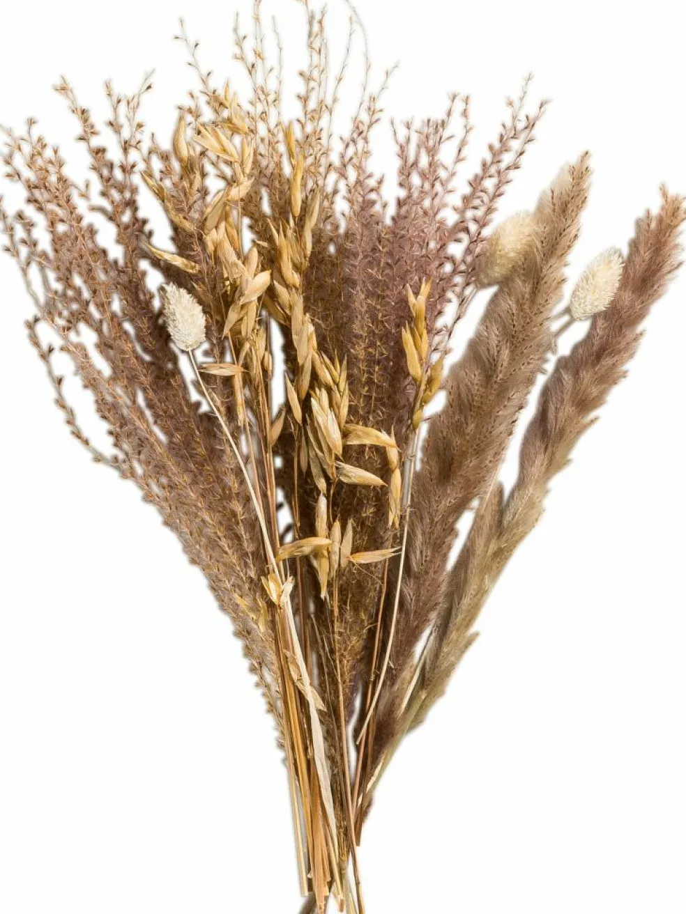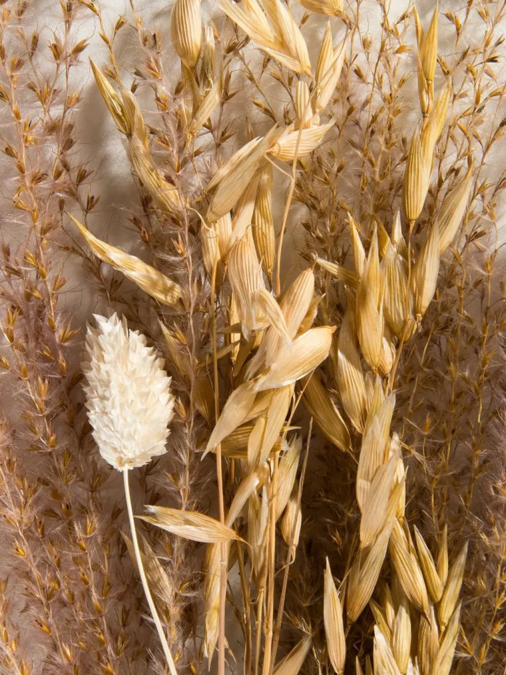 Gemischte Trockenblumen in Natur-Beige-Tönen.