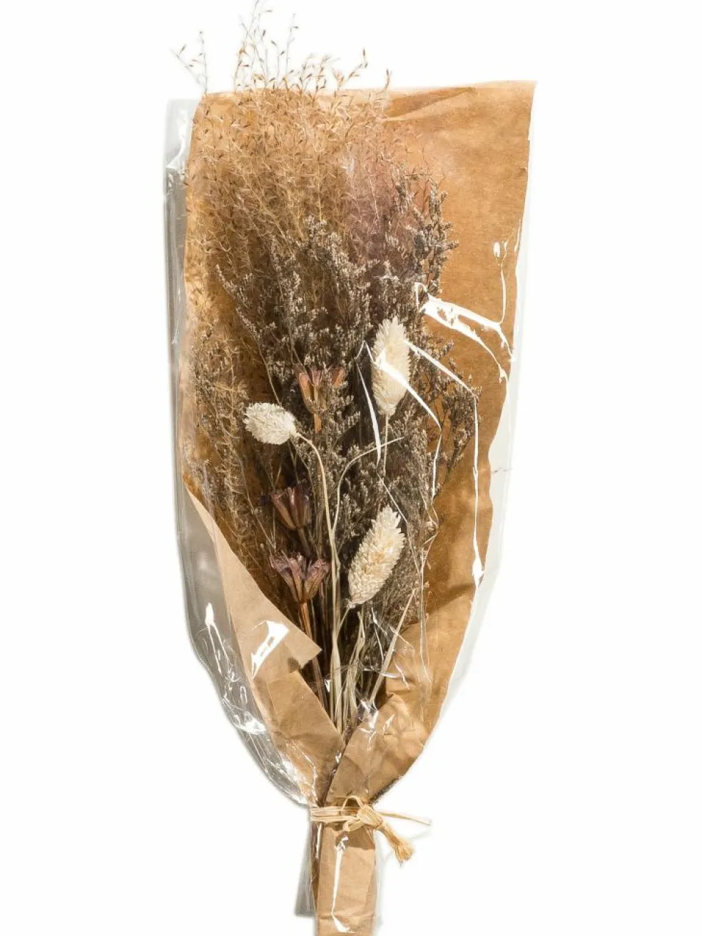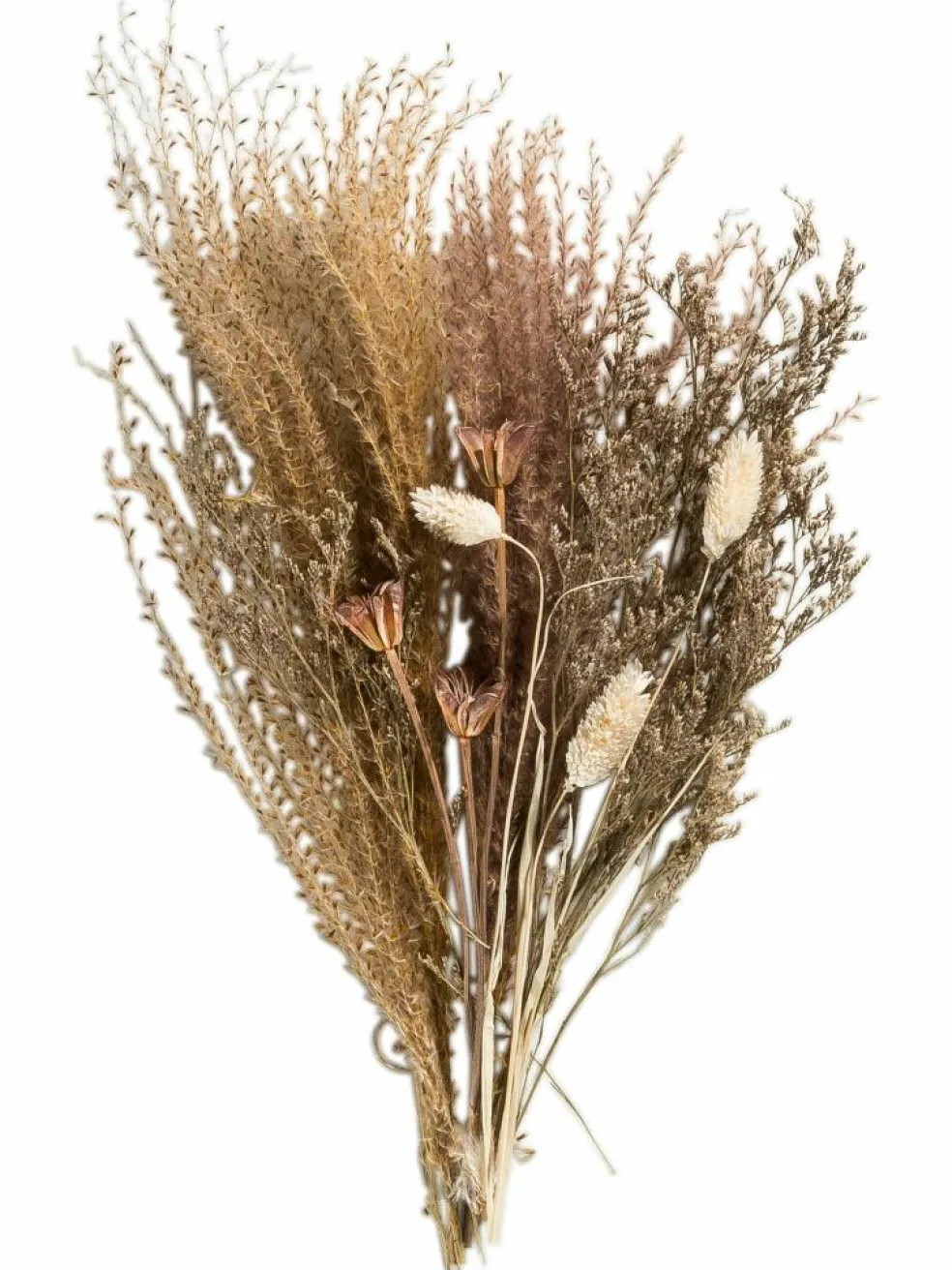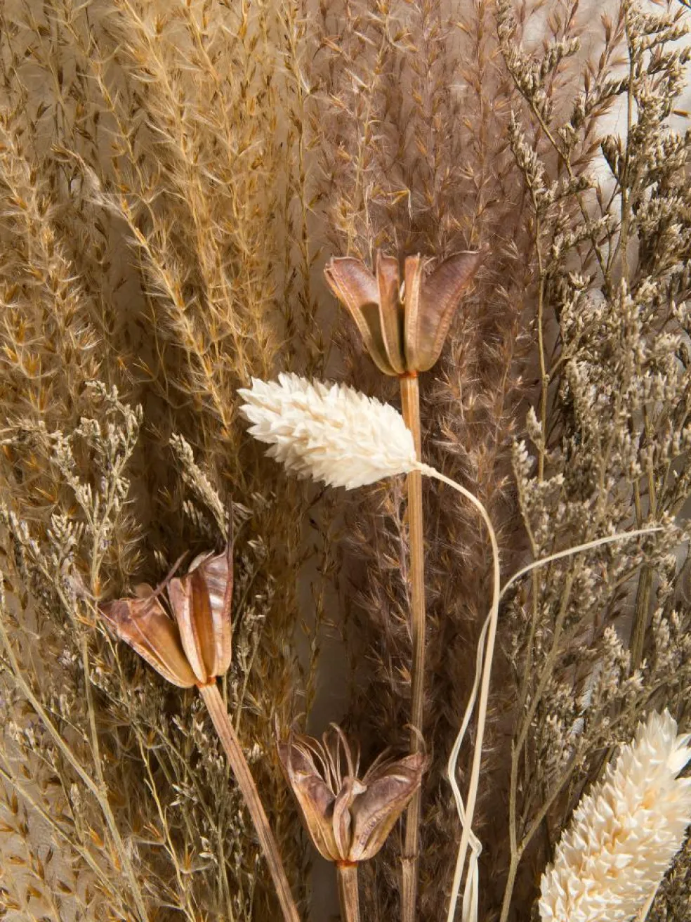 Gemischte Trockenblumen in Natur-Beige-Tönen.