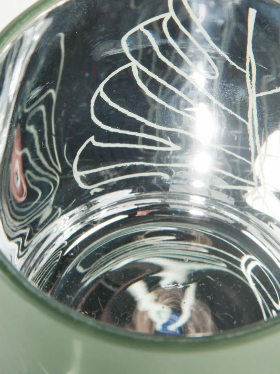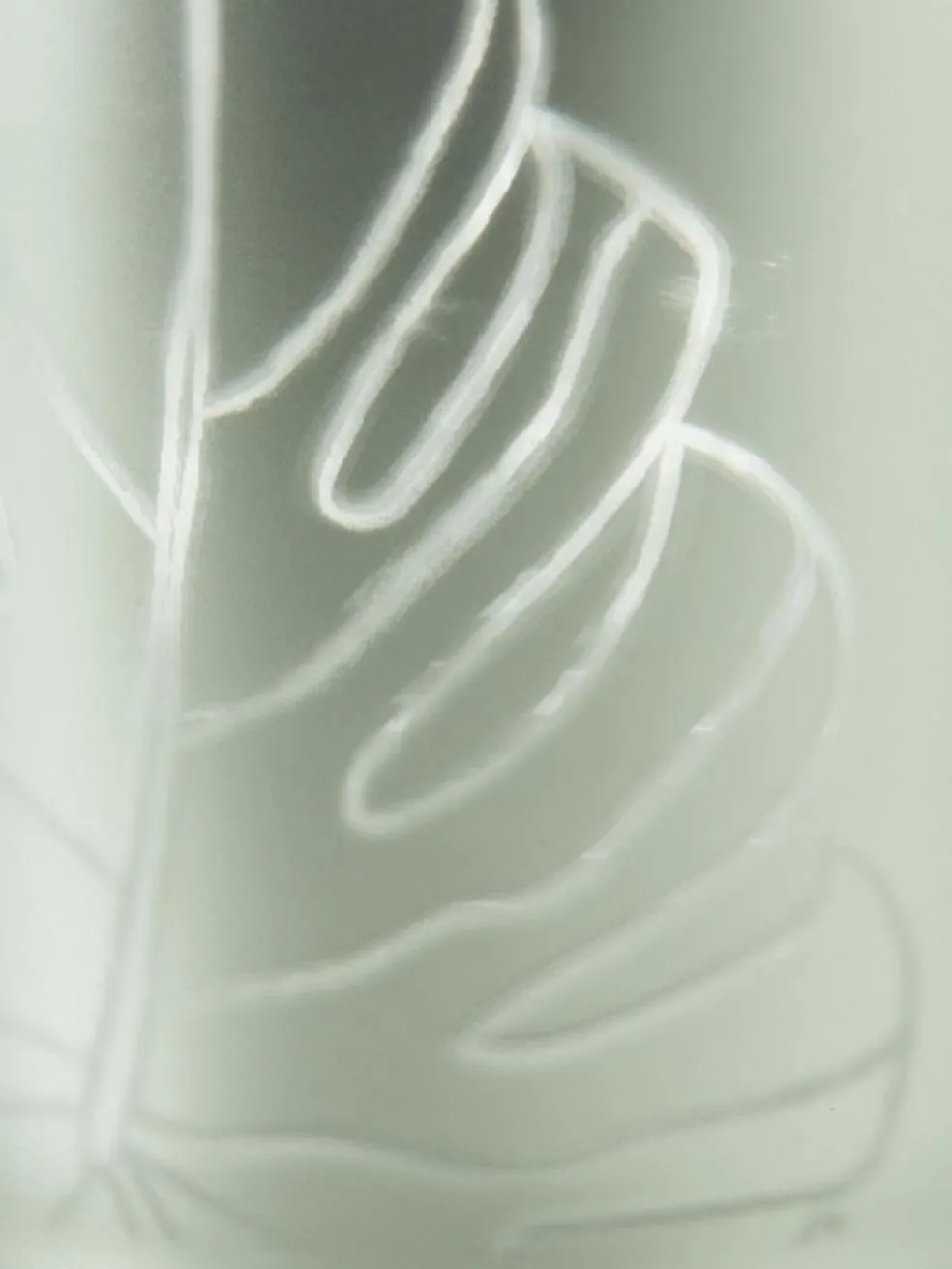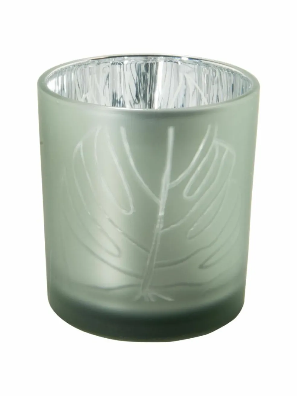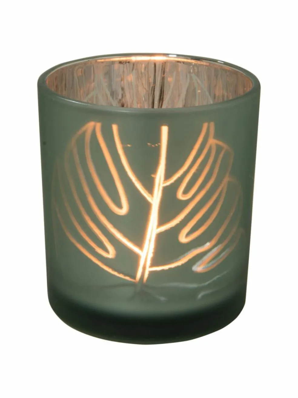 Teelichthalter aus Glas mit Laser Cut Motiv. Von innen silber verspiegelt mit Monstera-Motiv.