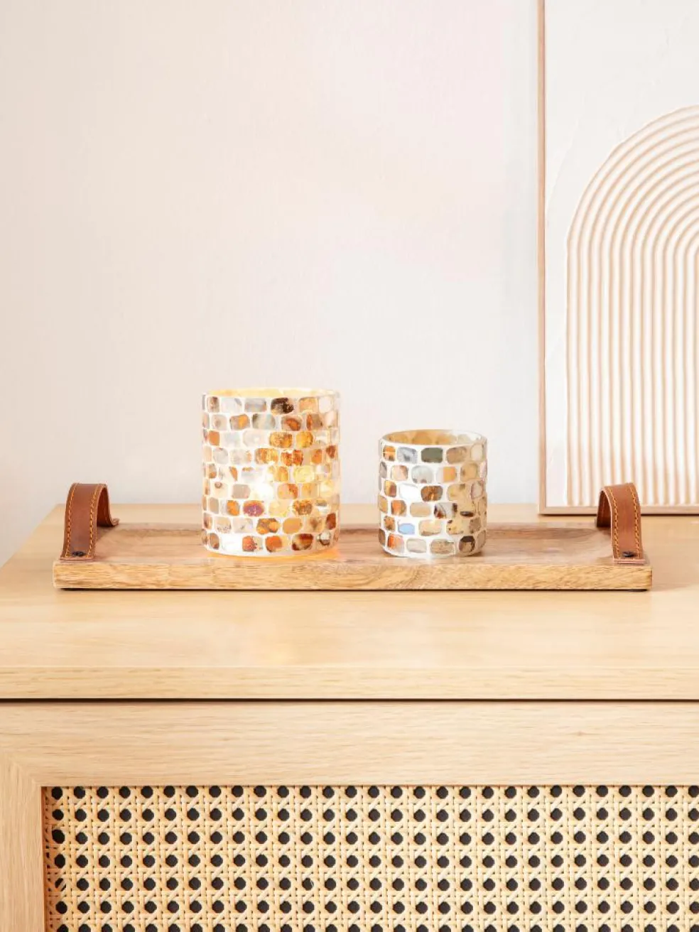 Wunderschönes Deko-Tablett aus hochwertigem Mangoholz. Die Griffe bestehen aus echtem Leder und machen den Transport einfach. Die helle Holzlasur rundet das natürliche Gesamtbild ab.