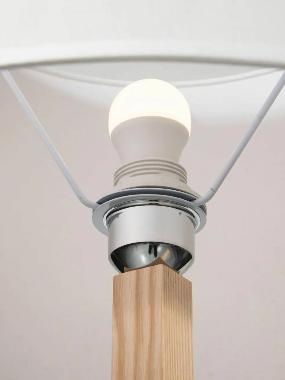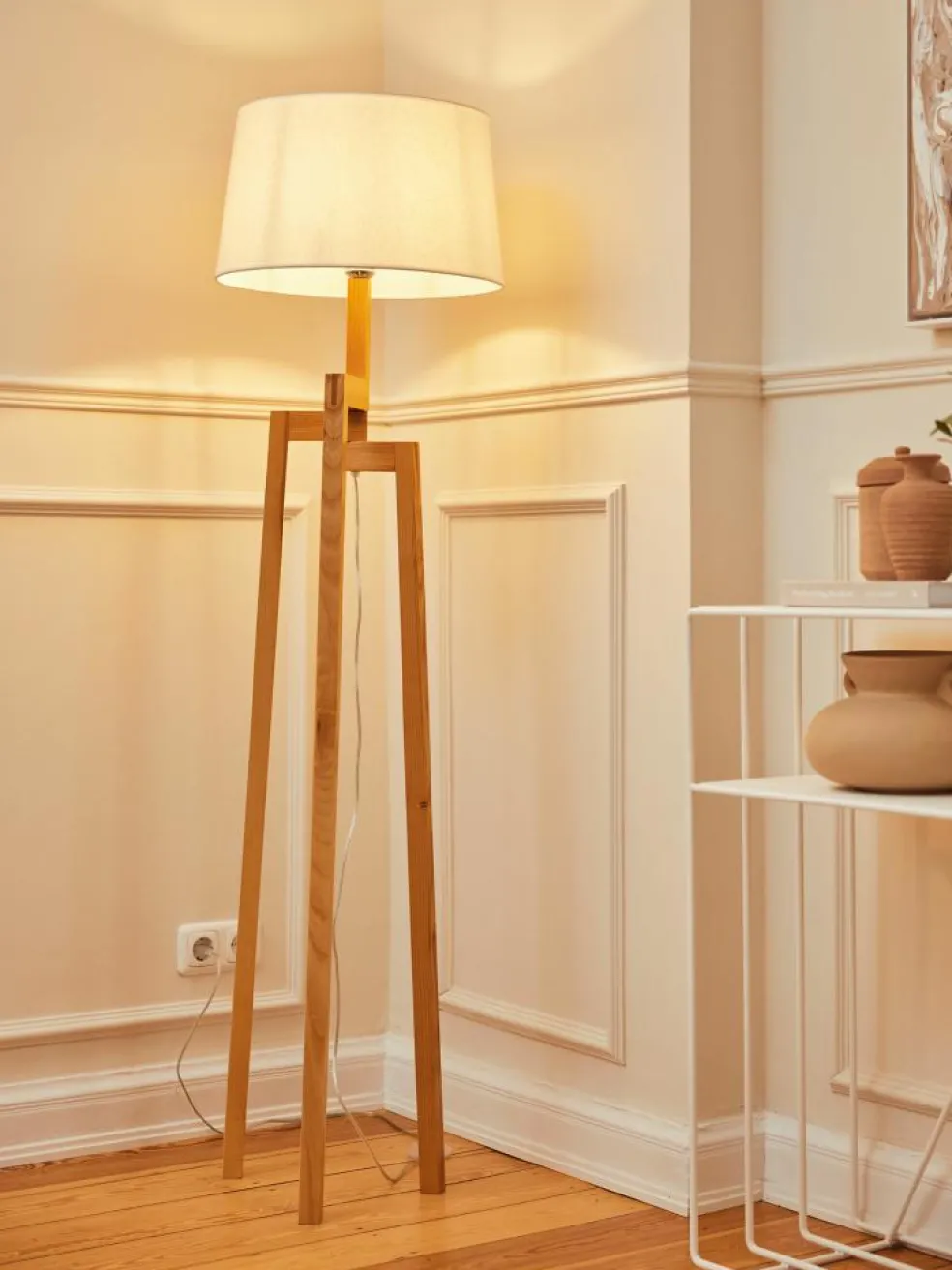 Stehleuchte im Skandi-Stil. Ständer aus Eschenholz und Lampenschirm aus Leinen gefertigt. Excl. Leuchtmittel E27 60W. Höhe ca. 160 cm.