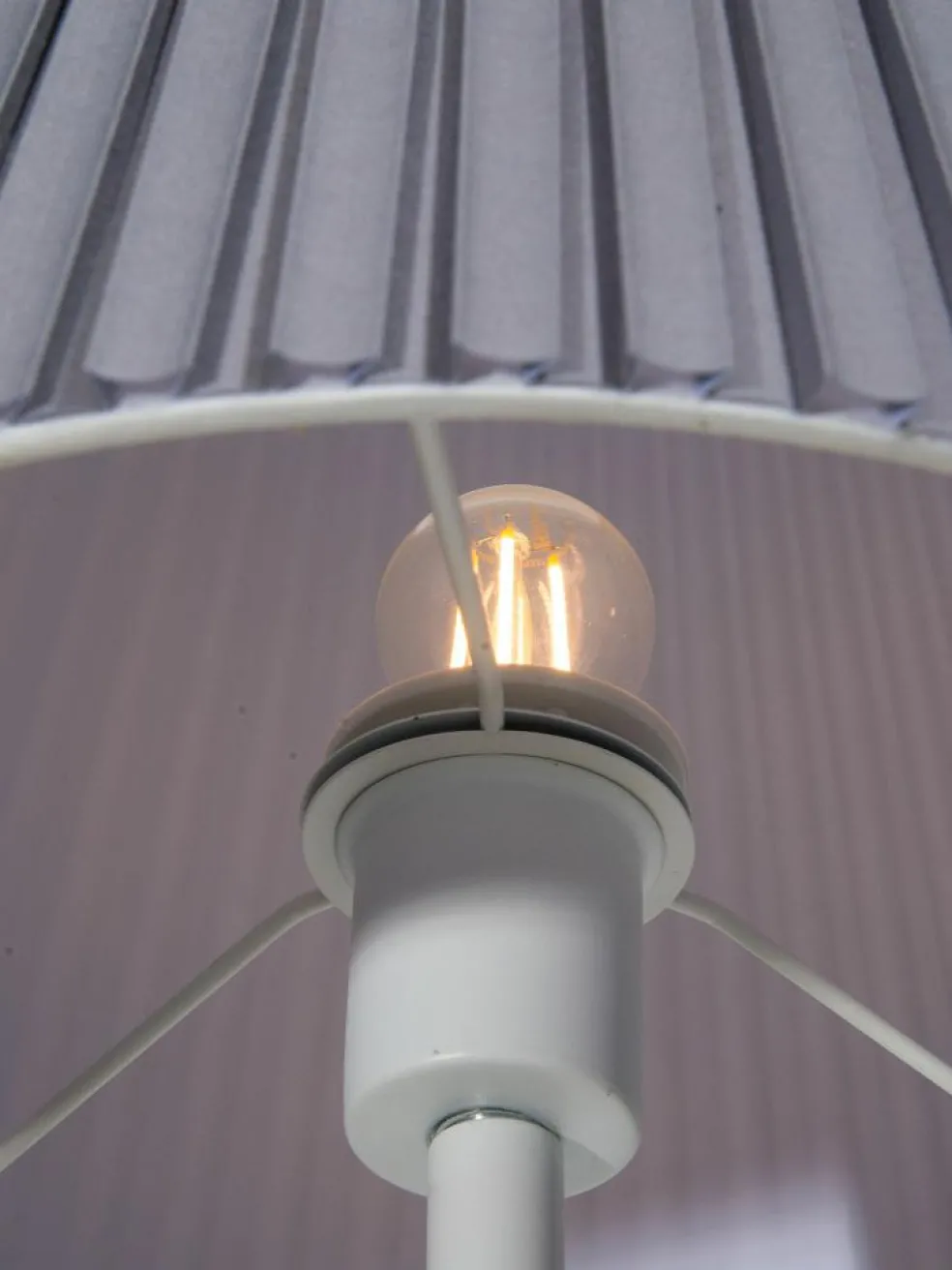 Norfis sorgt für ein natürliches Ambiente in Wohn-, Schlaf- oder Arbeitsräumen. Der Lampenfuß aus Metall wirkt durch die Holzoptik und die weißen Zierlackierungen besonders gemütlich. Der gefaltete Textil-Lampenschirm unterstützt diese Optik. Textilkabel weiß. Mit Kippschalter. Zu verwendende Leuchtmittel (nicht inklusive): E27, max. 9W LED, max. 20W CFL, max. 40W filament.