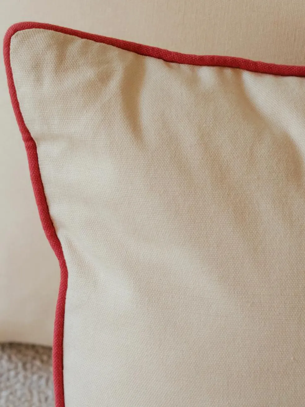 Das Kissen Nova ist ein unifarbenes Kissen aus 100 % hochwertiger Baumwolle (Kissenhülle). Die Grundfarbe ist ein zarter Cremeton, der die perfekte Basis für Kombinationsmöglichkeiten bietet. Durch die vier Farbvarianten des rundumlaufenden Kontrast-Paspels gibt es ein Nova Kissen für jeden Geschmack. Rot, Blau, Pink oder Beige – man kann seine Lieblingsfarbe wählen, oder sie alle miteinander kombinieren. Durch die cleane Optik trotz seiner spannenden Details, passt das Kissen perfekt zu anderen gemütlichen Wohnaccessoires, wie beispielsweise dem Luna Kissen, das genau wie das Nova ein Bestandteil der Kibek x Carmushka Kollektion ist. Das Nova Kissen ist bereits gefüllt und dadurch sofort einsatzbereit, außerdem kann die Hülle einfach gewaschen werden. Durch den praktischen, aber dezenten Reißverschluss, lässt sie sich leicht abziehen. Ein Produkt, an dem man lange Freude hat.