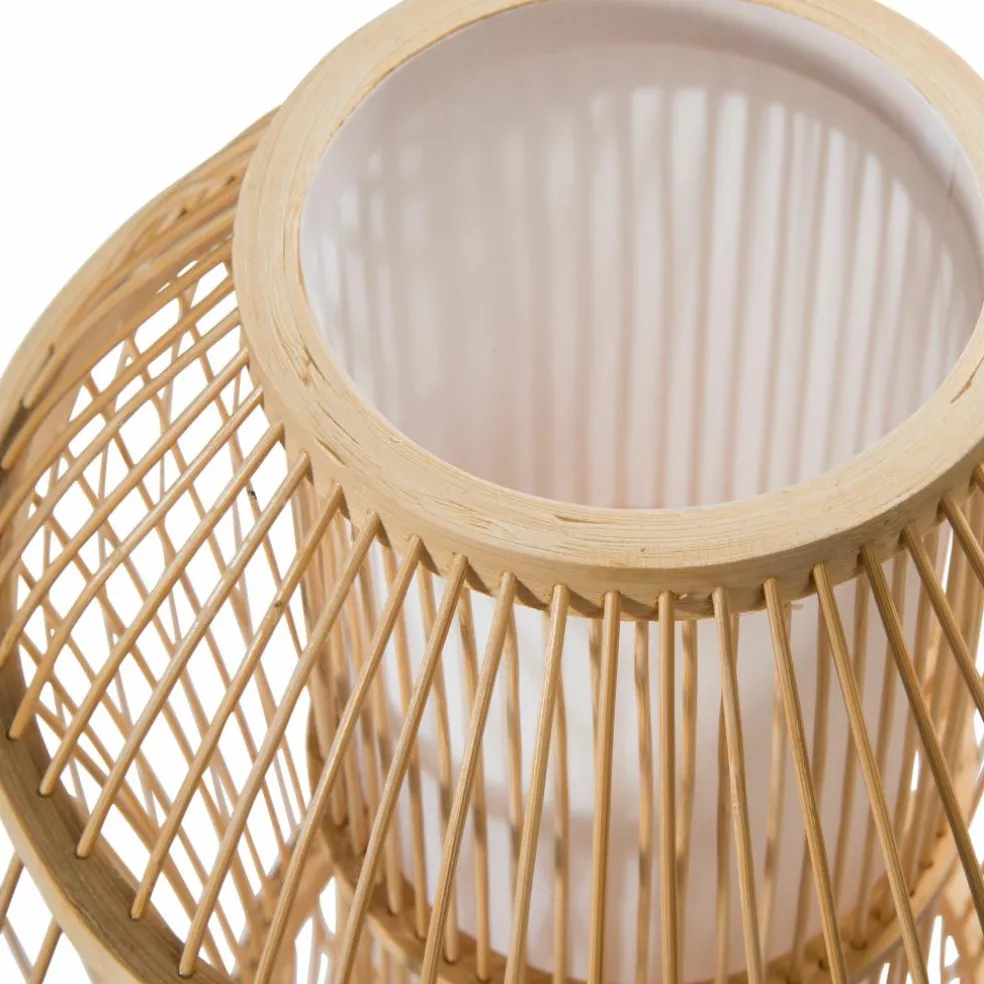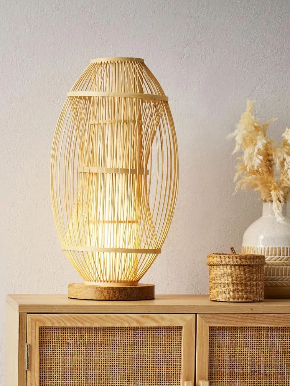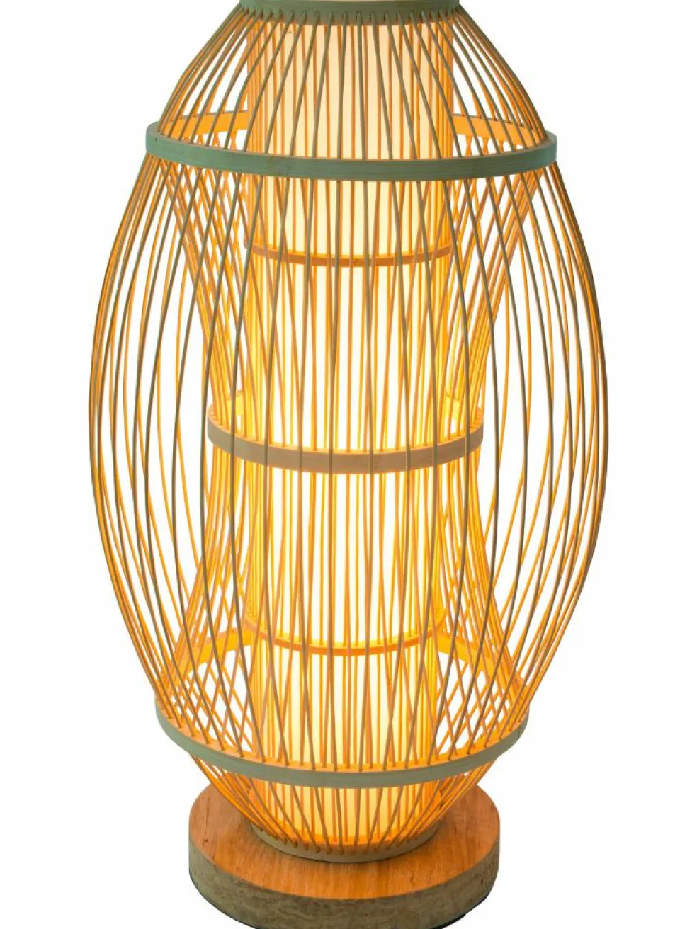 Bambusstäbe werden von Hand geformt und von Hand in die jeweiligen Ringe aus Bambus gesteckt.Bambus ist ein schnell wachsende Pflanze und deshalb ein beliebter, nachhaltiger Werkstoff. Exkl. Leuchtmittel E 27, 40 W. Oyoma ist ca. 51 cm hoch.