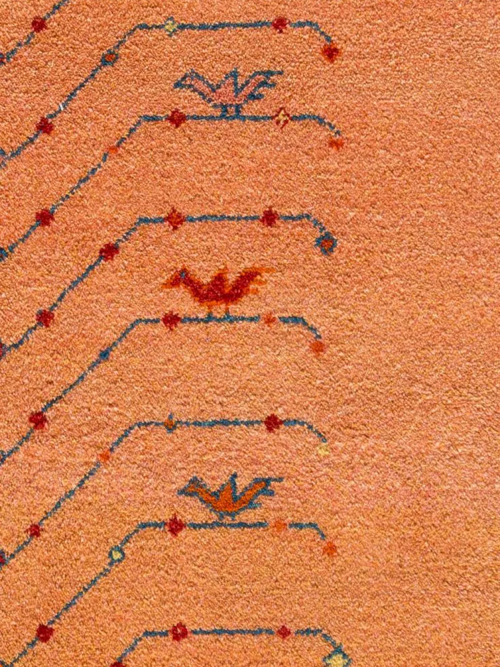 . Die Schur ist relativ hoch, der Griff fest. Die Muster sind meist schlicht oder eine Kombination mit traditionellen Mustern. Mustervorlagen gibt es nicht. Geknüpft werden alle Muster aus dem Kopf.| Gesamthöhe: | ca. 18 mm |